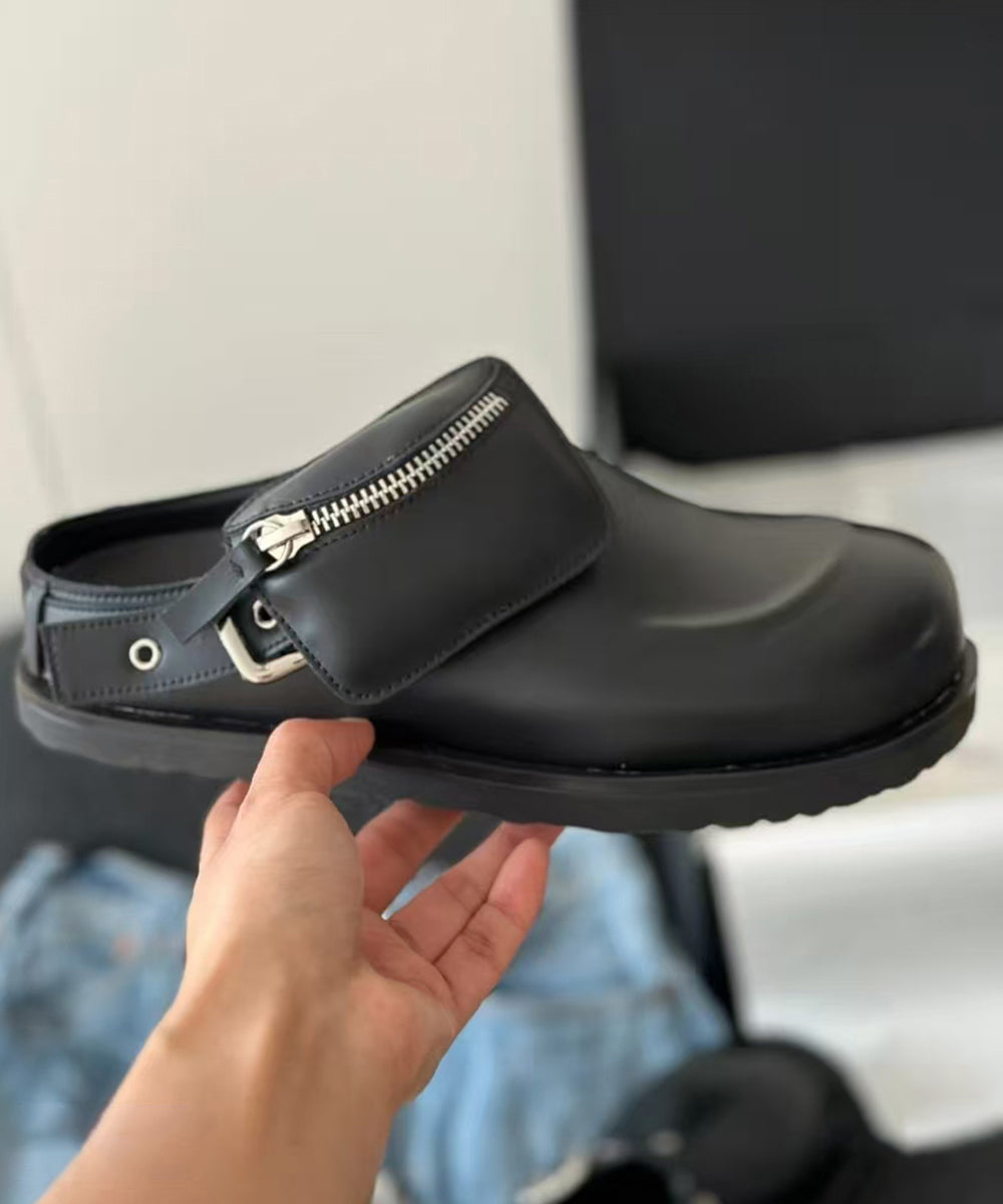 Fashion Splicing Platform Black Cowhide Leather Slide Sandals