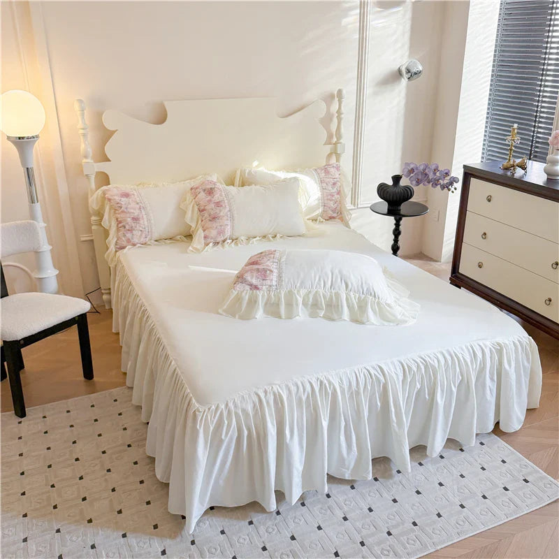 Korean Princess Style Lace Ruffles Rose Embroidery Wedding Bedding Set Duvet Cover Set Flat/Fitted Bed Sheet Pillowcases 4Pcs