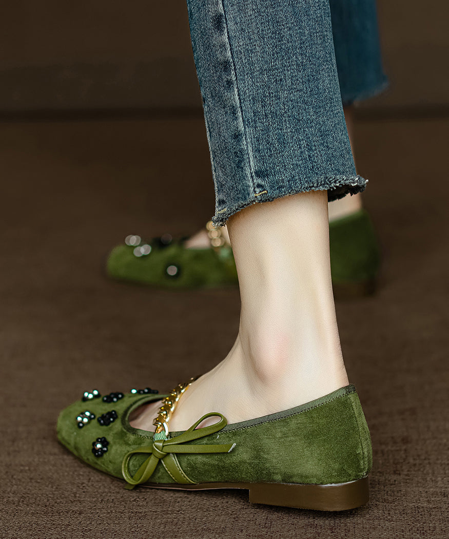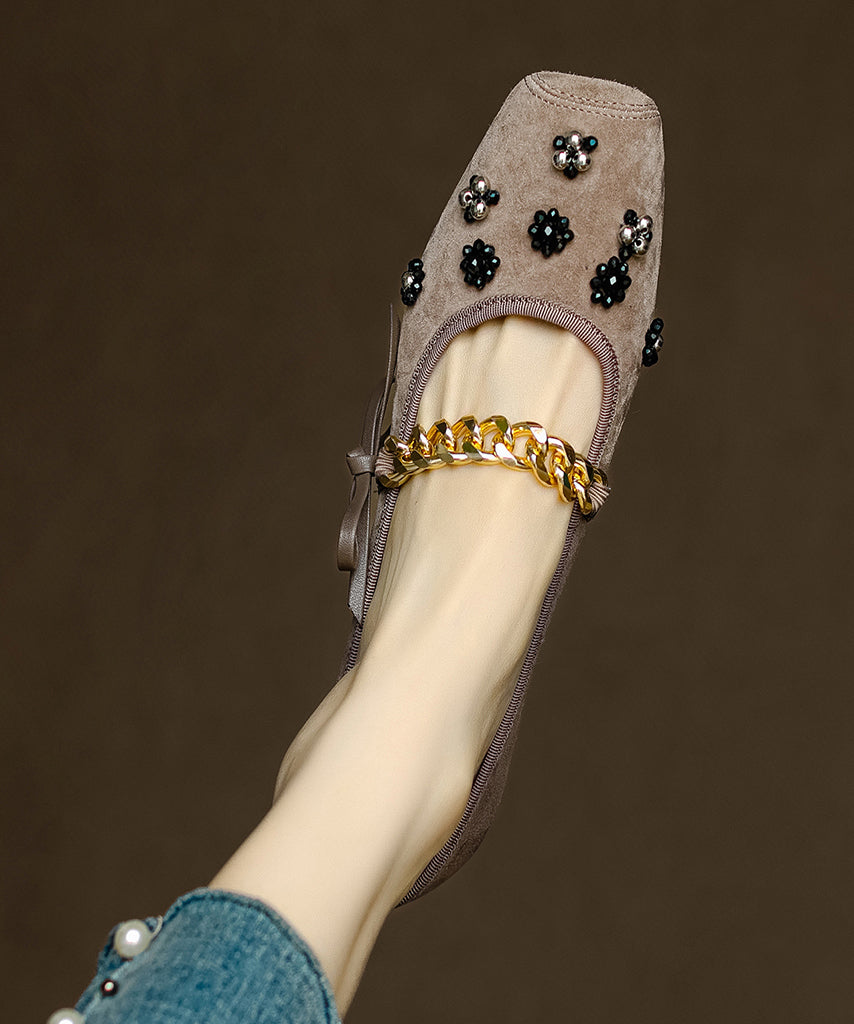 French Apricot Square Toe Bow Nail Bead Flats Shoes