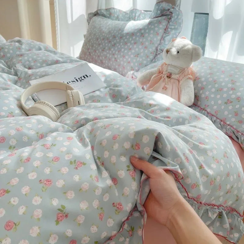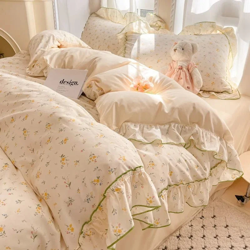 French Country Bedding Set - Ruffled Duvet Cover + Pillowcases (Queen Size. Soft Girls' Quilt-Style Decor)