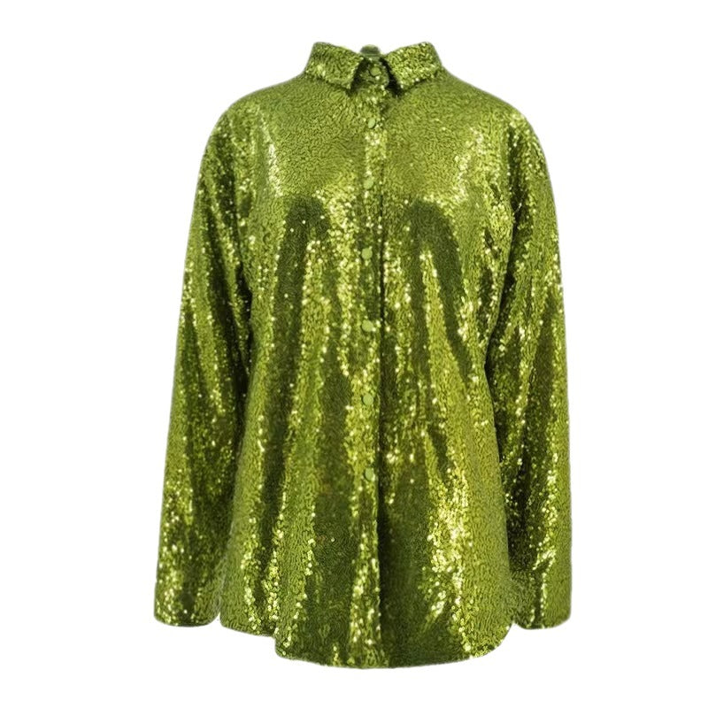 Stay on trend with this Green Sequined Turn-Down-Collar Long Sleeve Top. Designed for the fashion-forward woman. this top features a turn-down collar and button-up closure for a sophisticated and stylish look. Made with lightweight and breathable materials. this top is perfect for any spring or summer occasion.