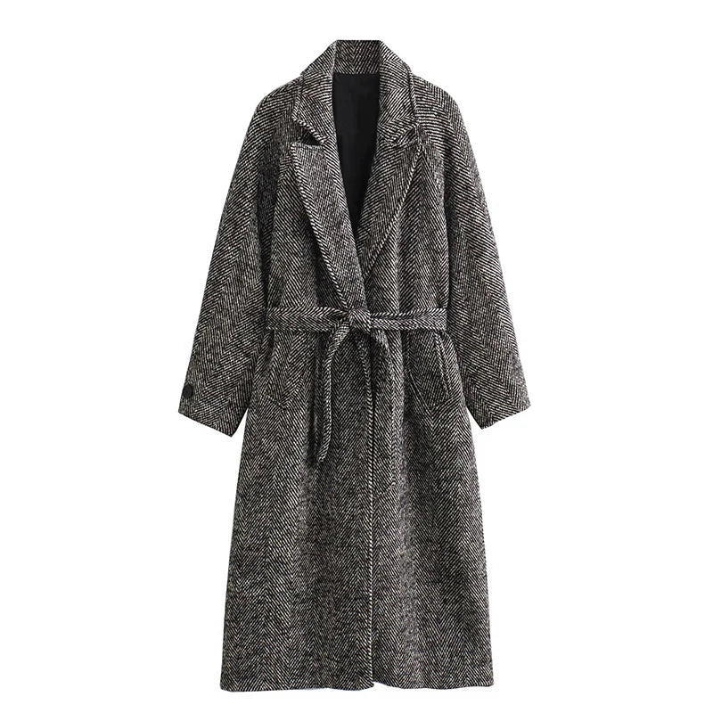 Herringbone Long Sleeves Belt Coat