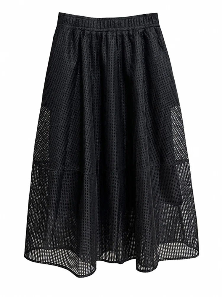This black mesh spliced midi A-line skirt features a high elastic waist for a comfortable fit and effortless style. Its versatile design allows for easy pairing with any top. making it a must-have piece for any wardrobe.