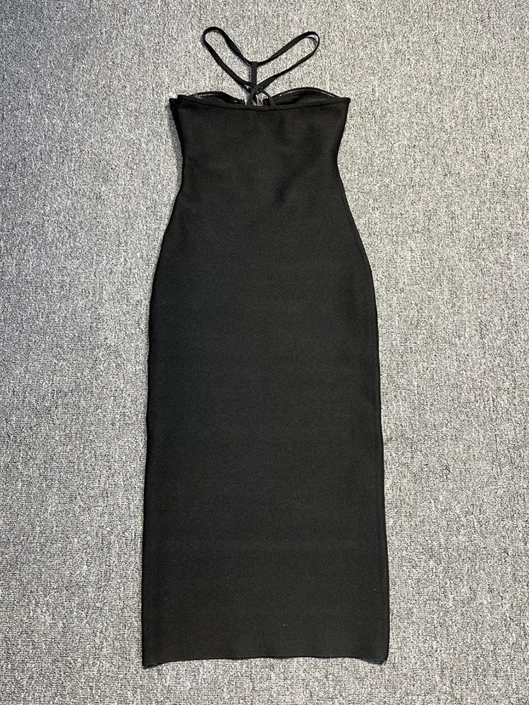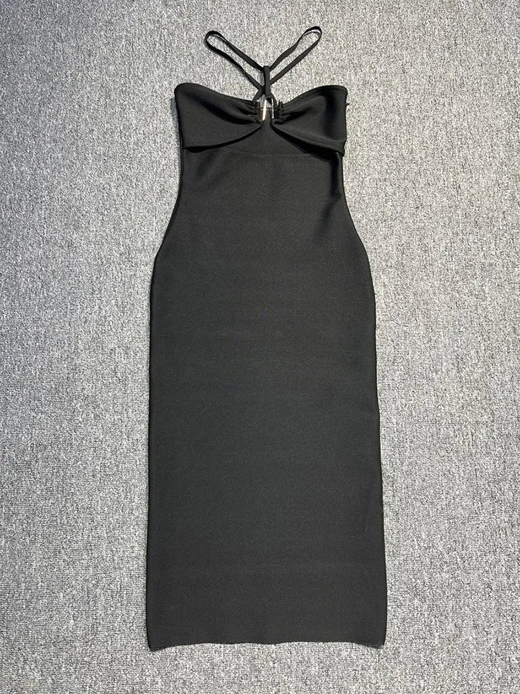 This dress is expertly designed to accentuate curves and create a flattering silhouette. The halter neckline adds a touch of elegance. while the bandage fabric sculpts and supports the body.