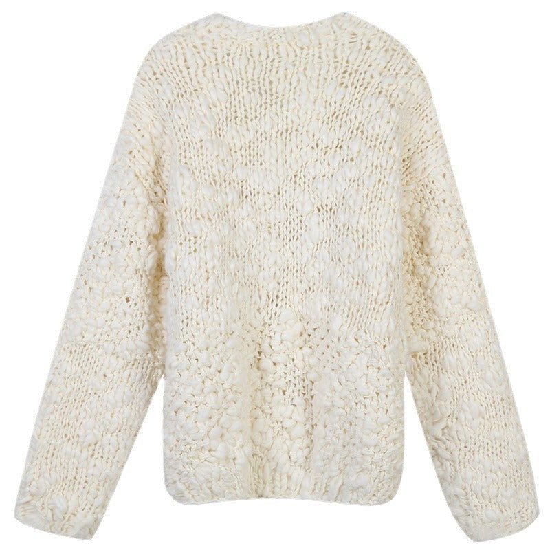 Experience ultimate comfort and style with our Hook Flower Loose V-Neck Knitted Sweater. The loose fit and v-neck design provide a flattering and relaxed look. while the hook flower detail adds a touch of elegance.