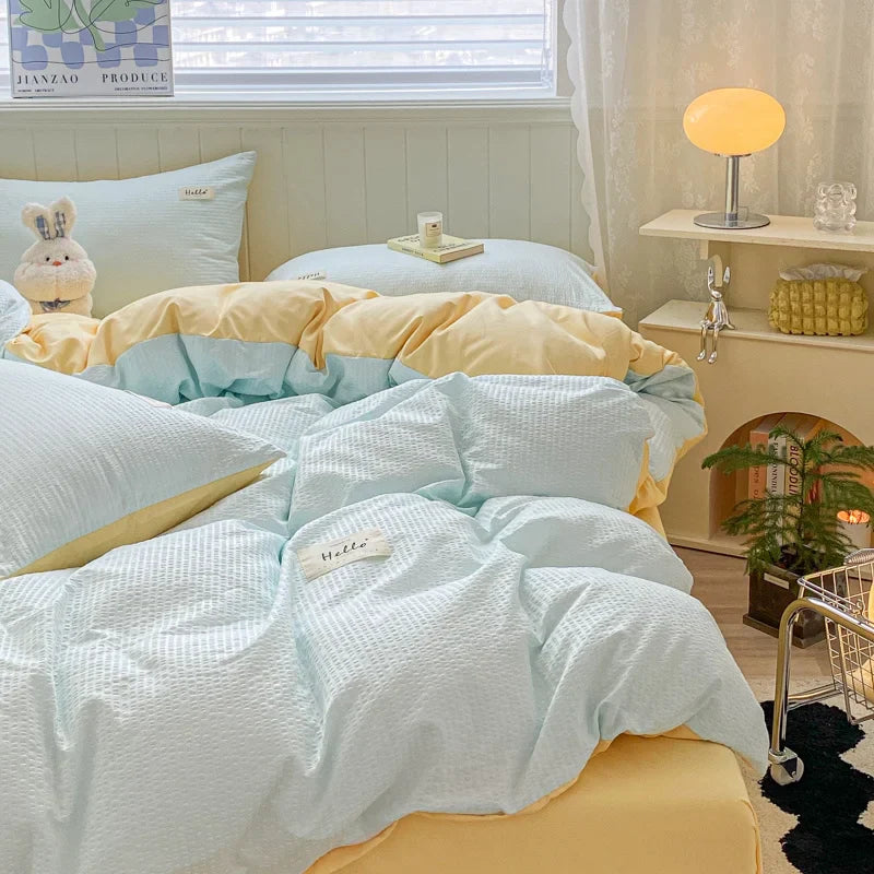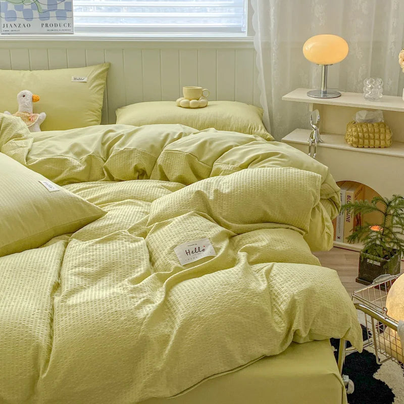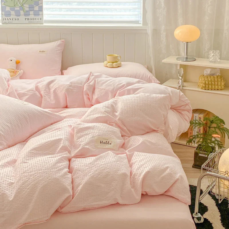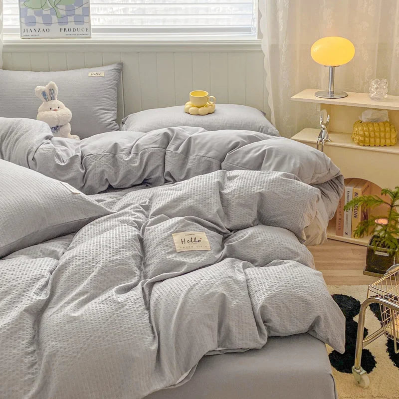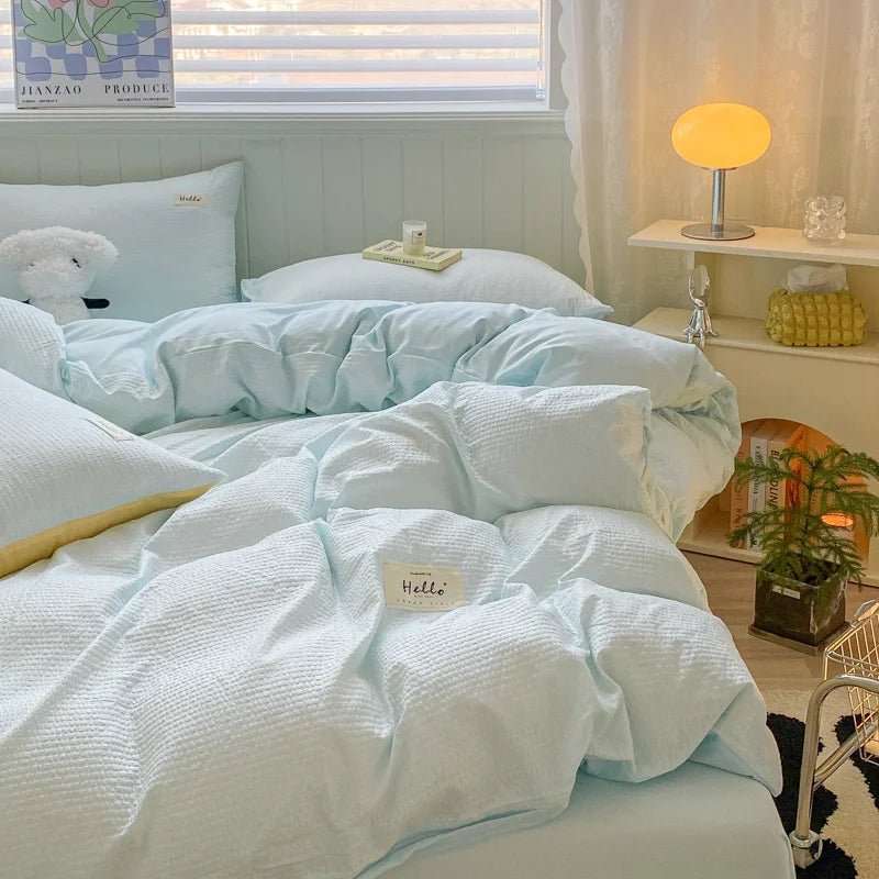 Iins Seersucker Washed Cotton Four-Piece Bedding Set Cotton Solid Color Quilt Cover Set Bedding Three-Piece Set Bed Sheet
