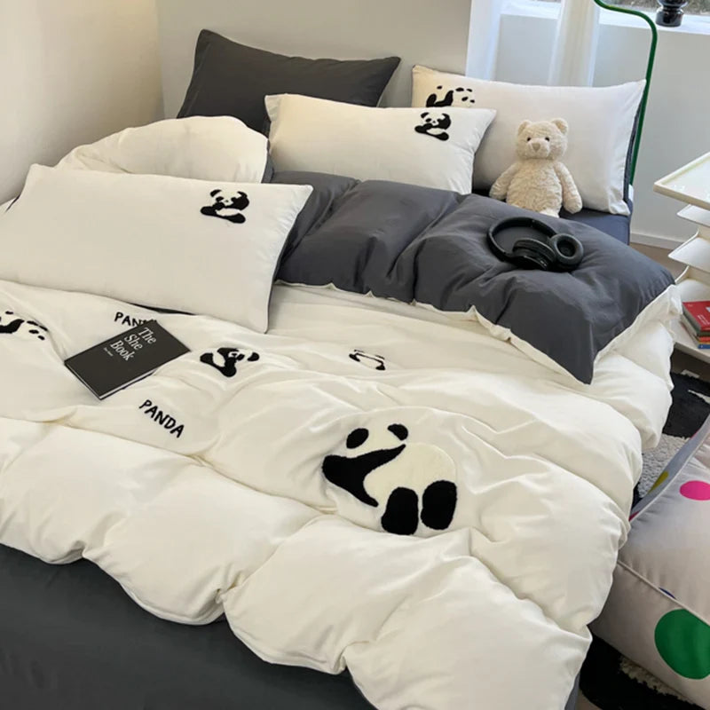 Ins Cartoon Panda Bedding Set Towel Embroidery Duvet Cover Queen Twin Full Size Grey Bed Flat Sheet Quilt Cover Pillowcases