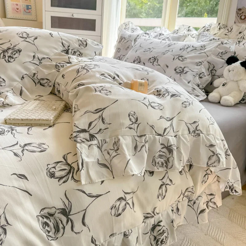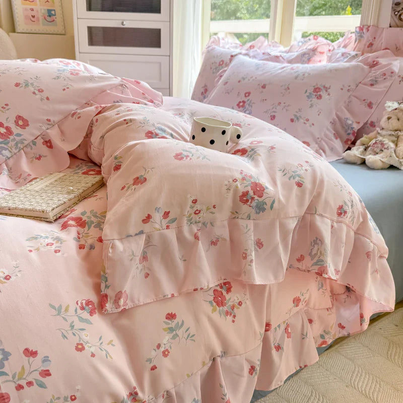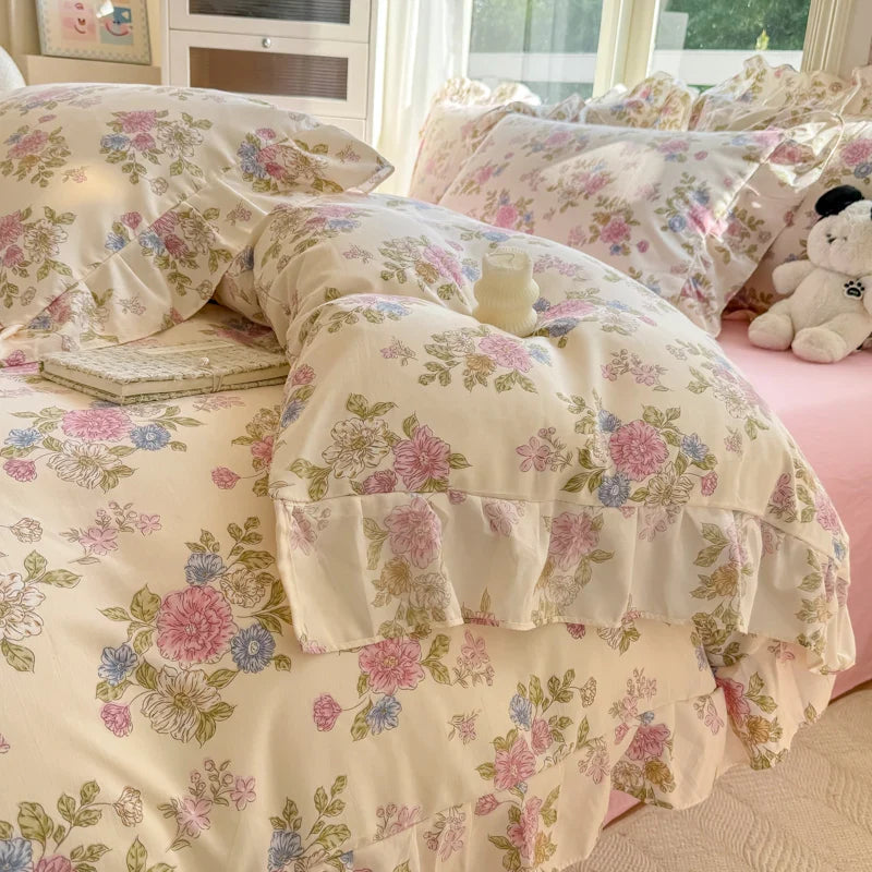 INS Floral Style Bedding Sets Ruffle Lace Bow Quilt Cover Romantic Bedclothes Decor Woman Girls Bedroom Duvet Cover 4pcs