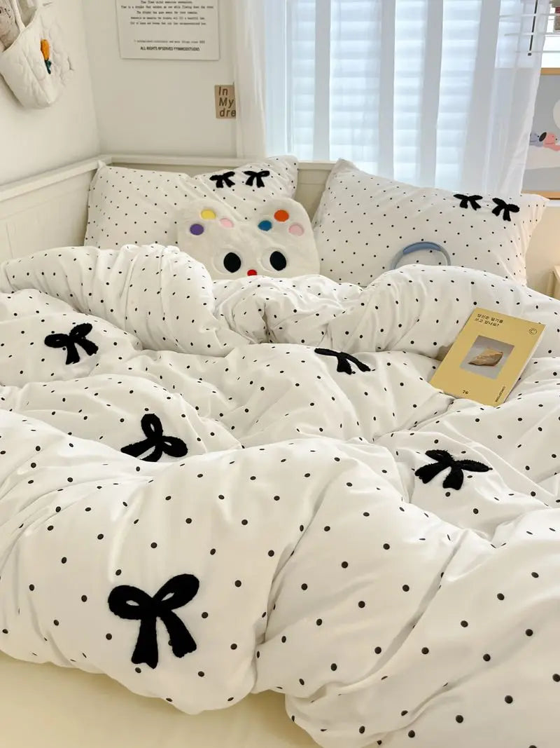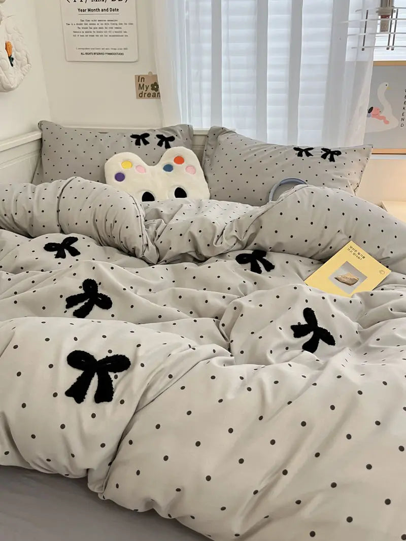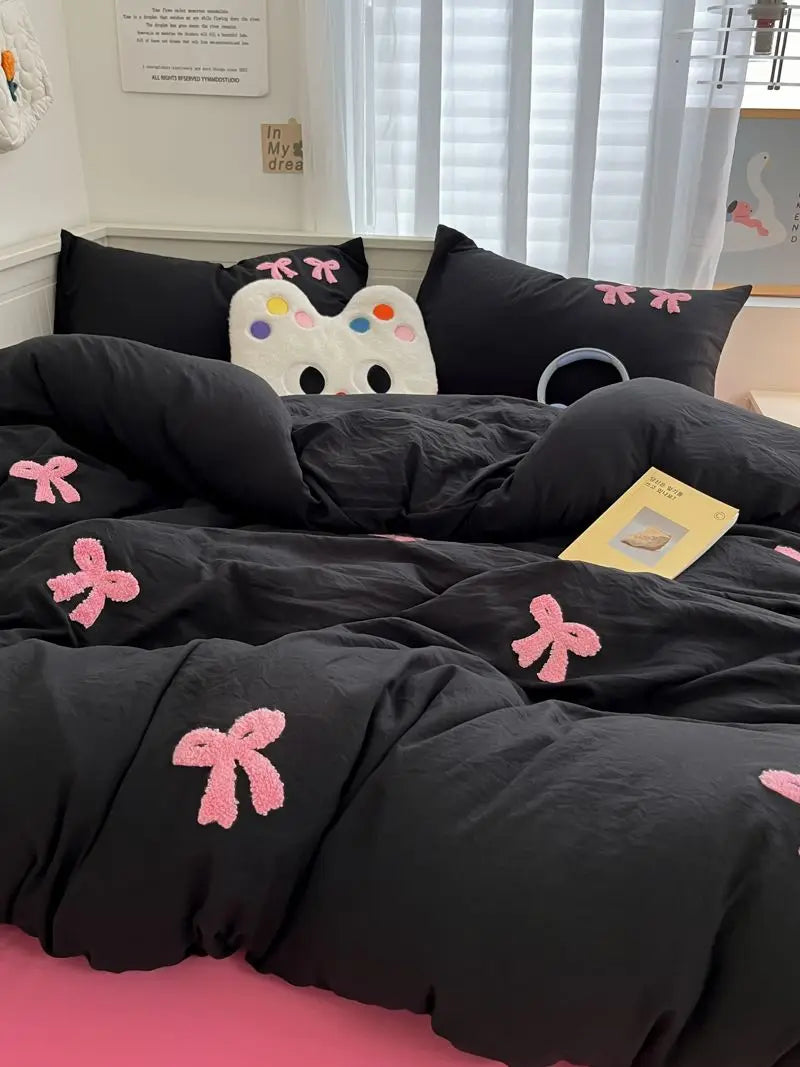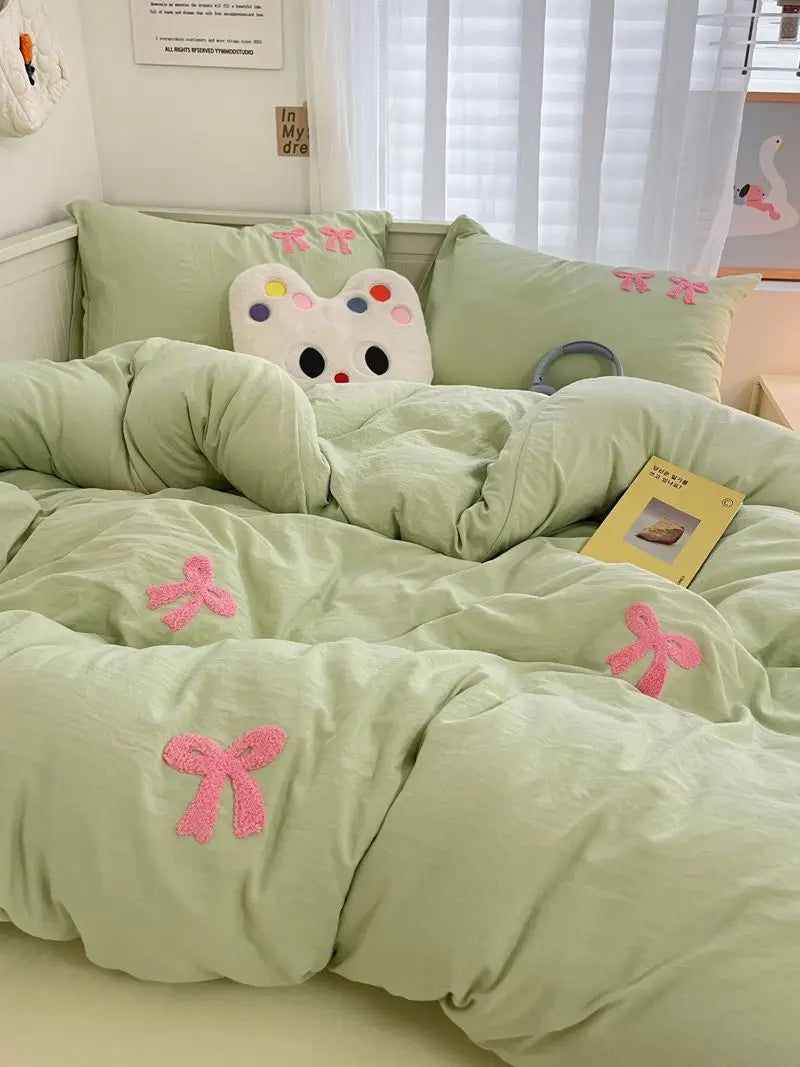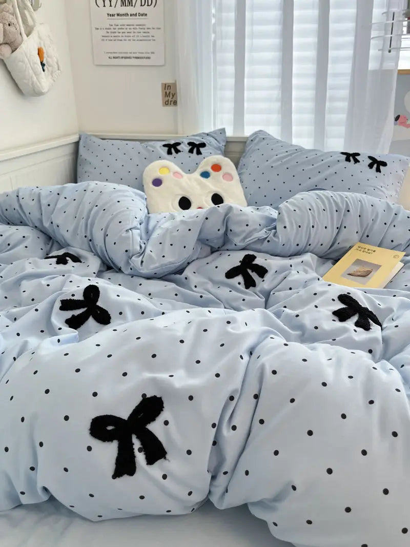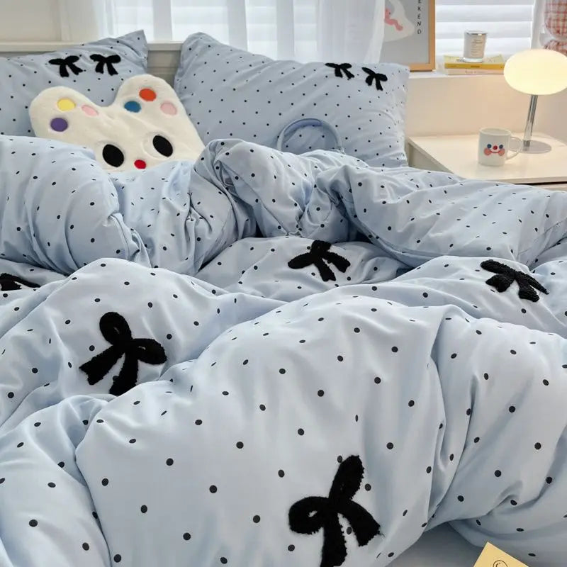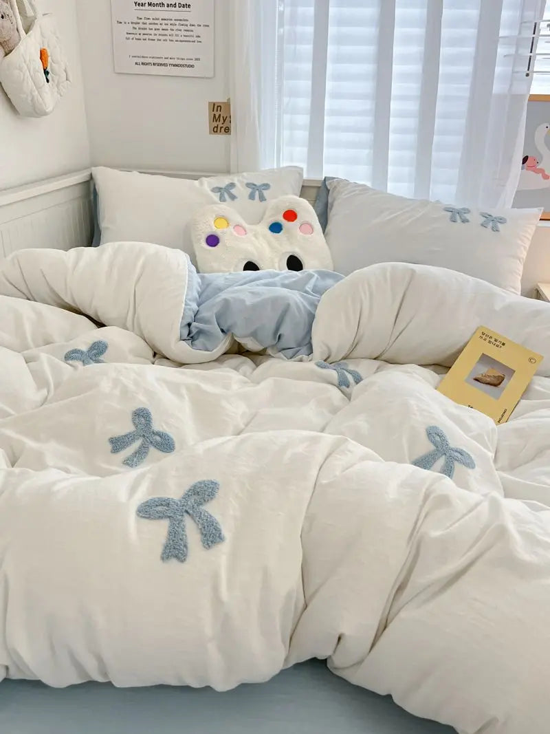 Ins Style Girl Blue 1.5m/1.8m Fitted Sheet Bow Towel Bedding Set Embroidery Washed Cotton Four-piece Set Bed Sheet Three-piece