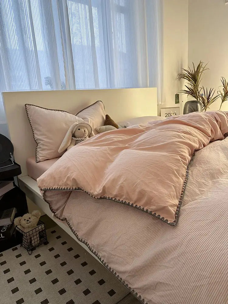 Ins Style Solid Color Stripes Mix and Princess Style Quilt Cover Four-piece Bedding Set Washed Cotton Shell Edge Duvet Cover Set