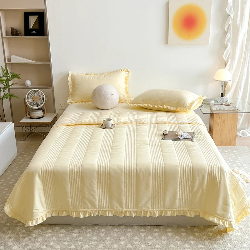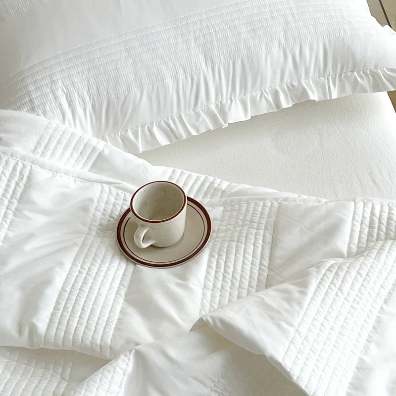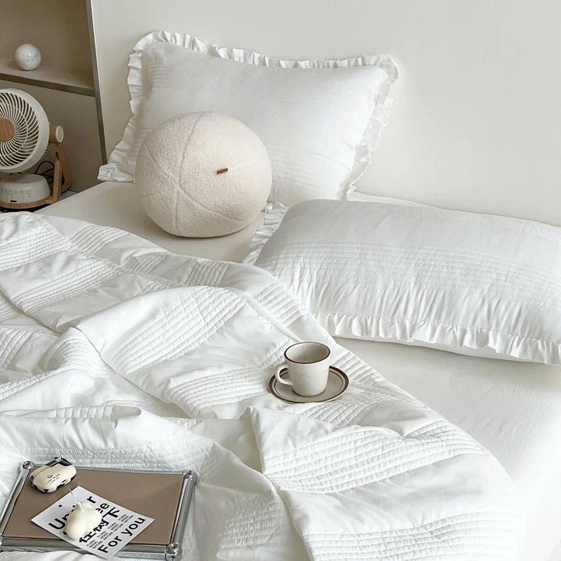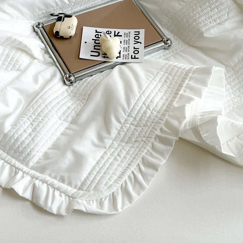 INS Style White Pink Quilted Ruffles Quilt Blanket Bedspread Washed Solid Color Korean Princess Style Summer Thin Quilt 1/3Pc