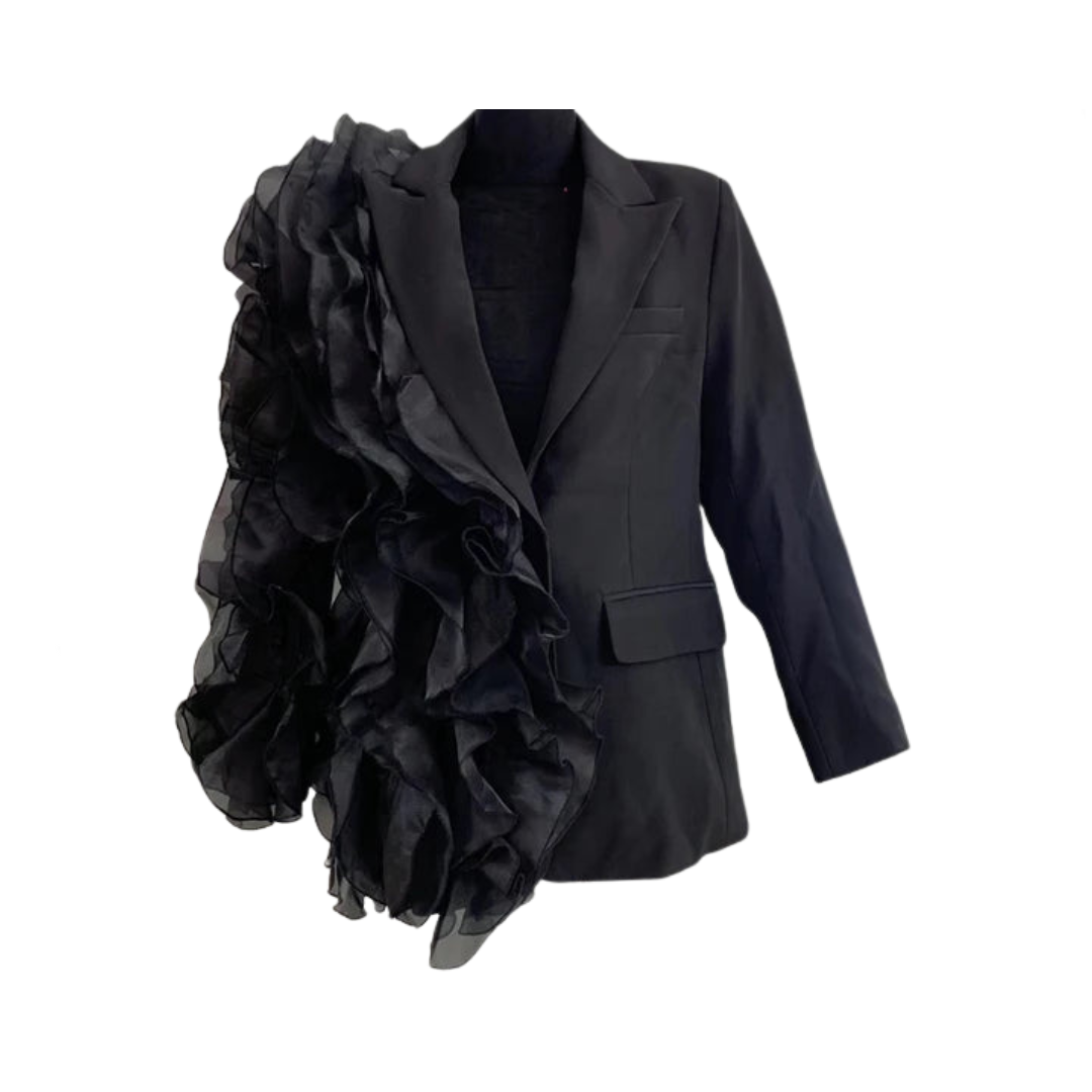Introducing the Irregular Ruffled Suit Jacket. a stylish and sophisticated addition to any wardrobe. With its unique ruffled design and impeccable tailoring. this jacket is sure to elevate any outfit.