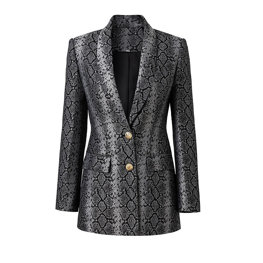 This Jacquard Leather Mid-Length Two-Button Blazer combines a sophisticated design with premium materials. The jacquard leather adds a luxurious touch. while the two-button closure adds a classic and flattering silhouette.