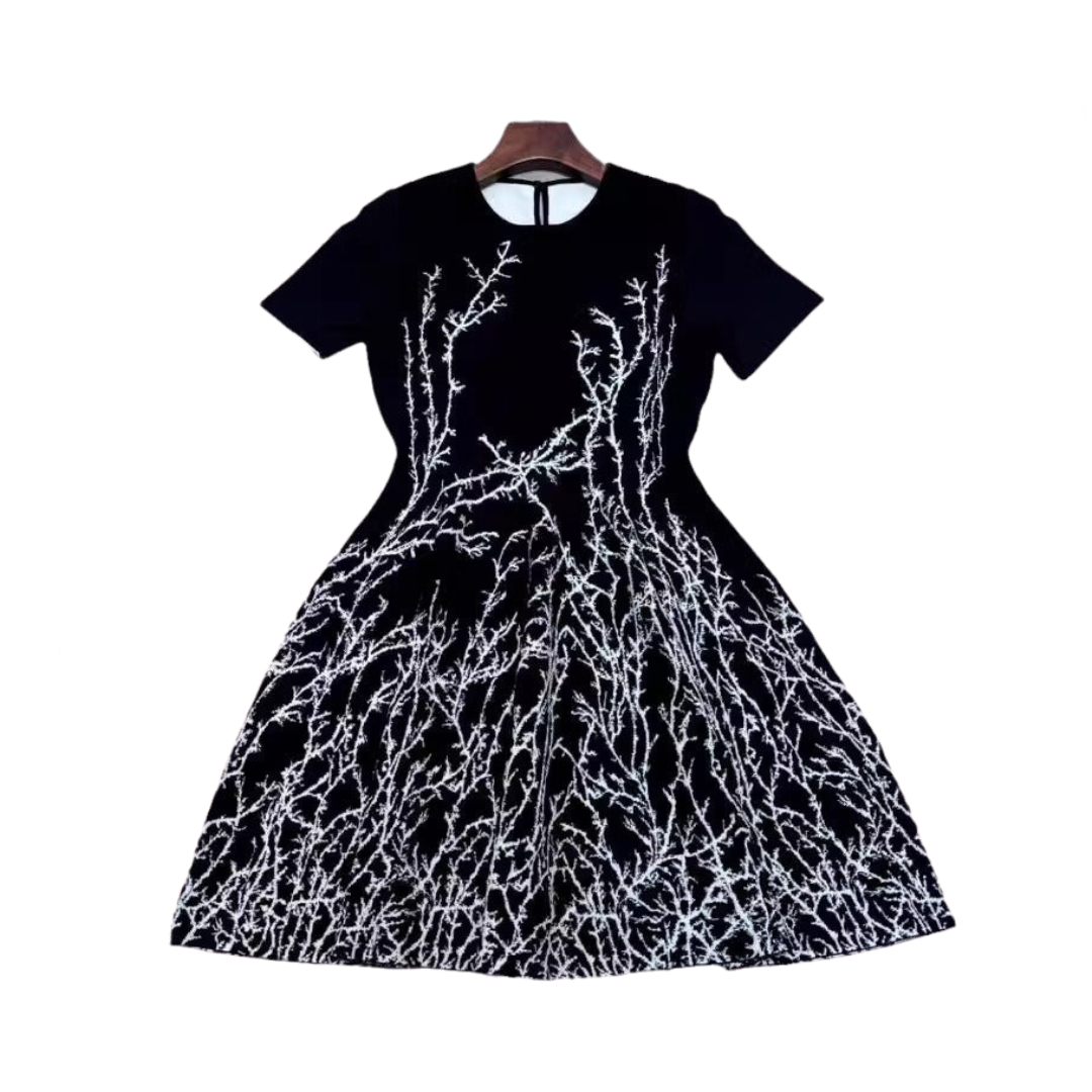 This dress features a jacquard woven design. round neckline. and short sleeves. With its classic silhouette and modern details. this dress is the perfect addition to your wardrobe.