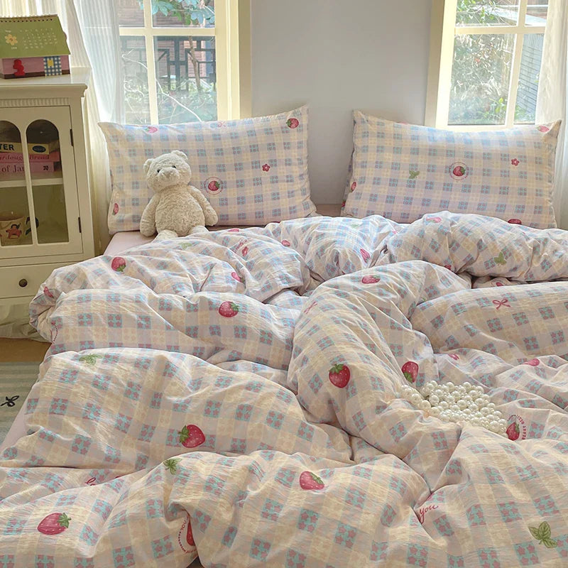 Kawaii Strawberry Bedding Set Kids Adults Duvet Cover and Flat Sheet Pillowcase Single Double Full Size Girls Bed Linen