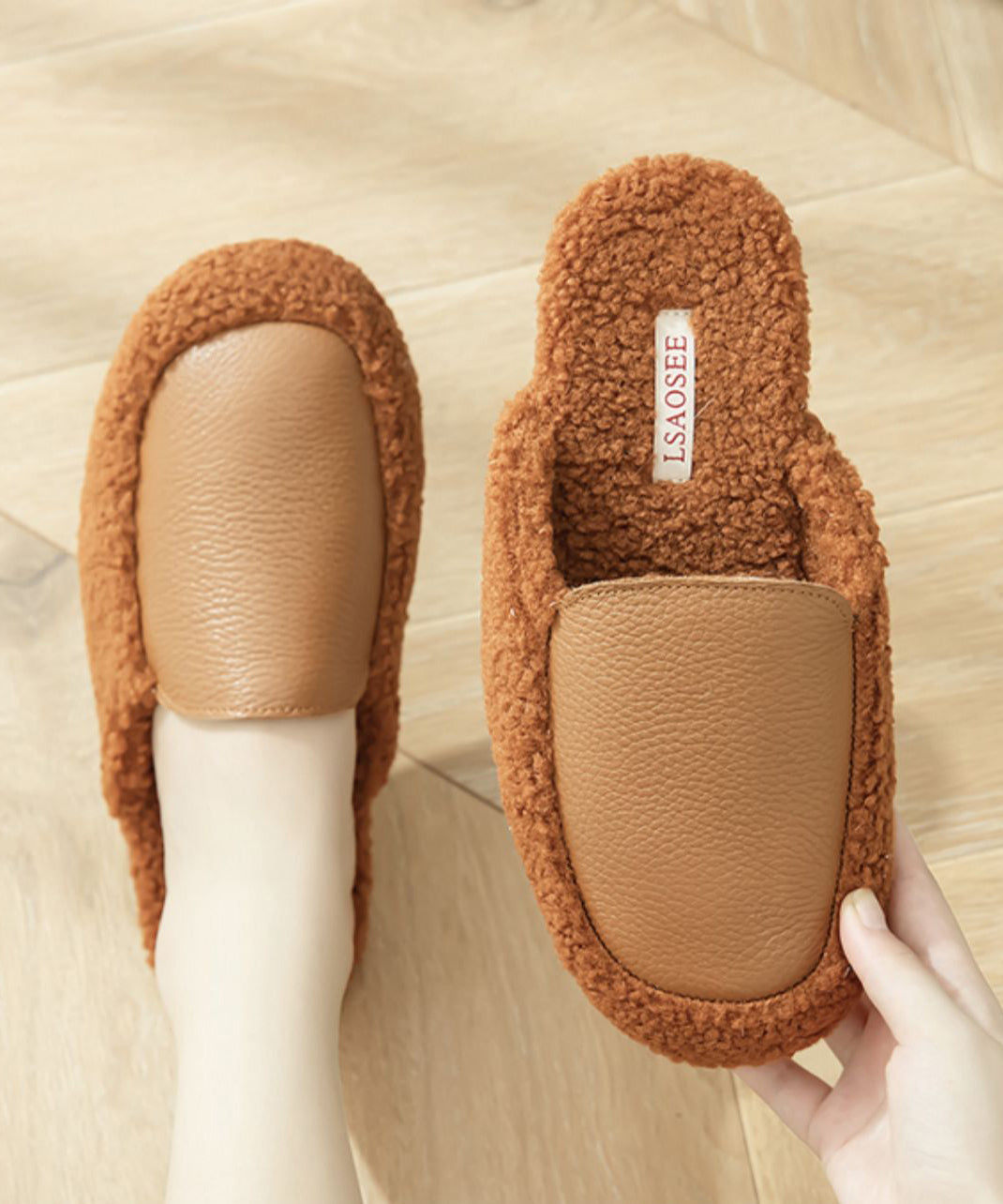 Khaki Comfy Slippers Shoes Splicing Fuzzy Wool Lined
