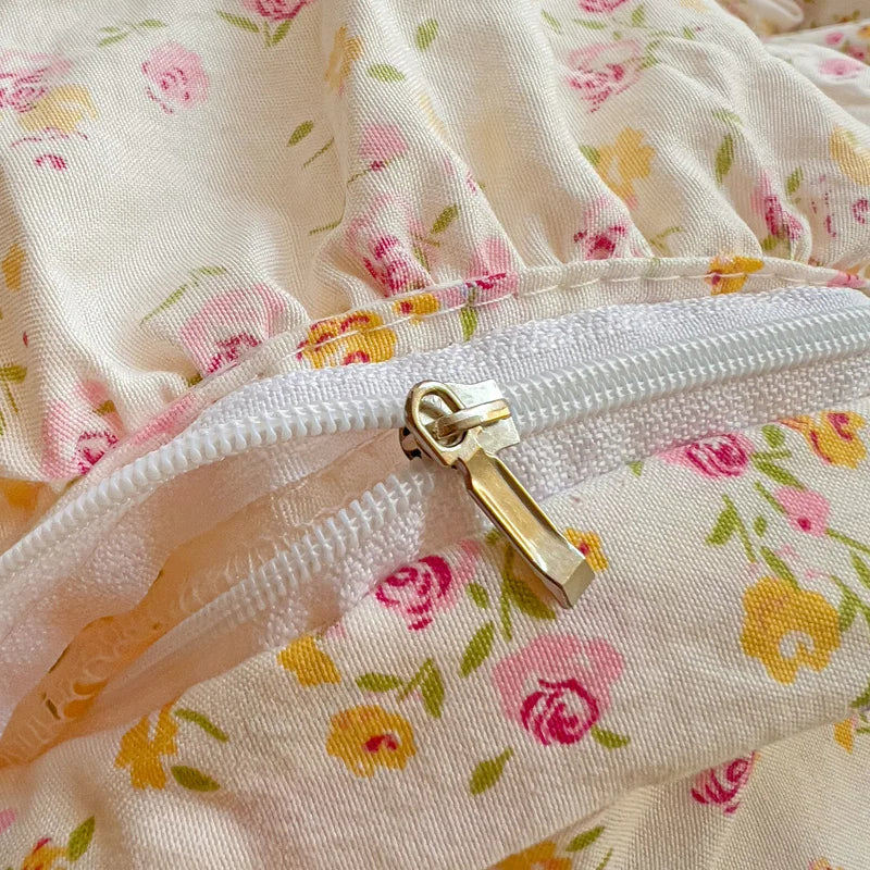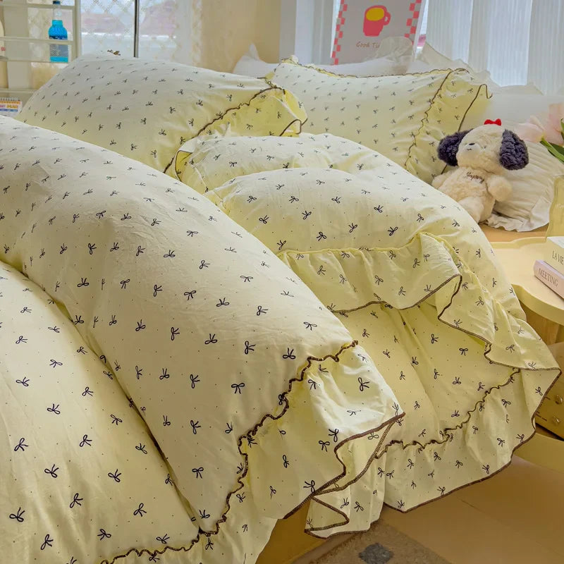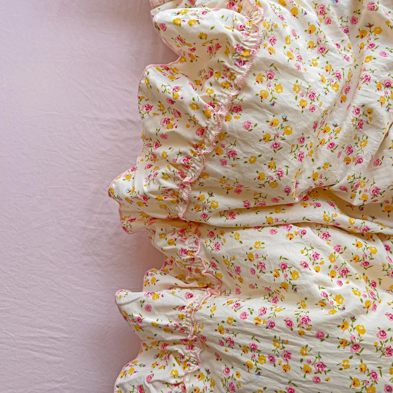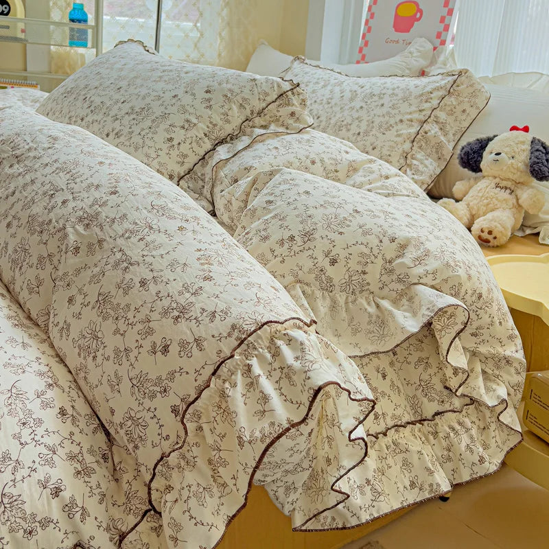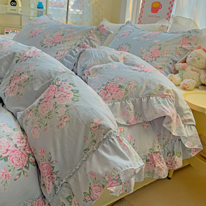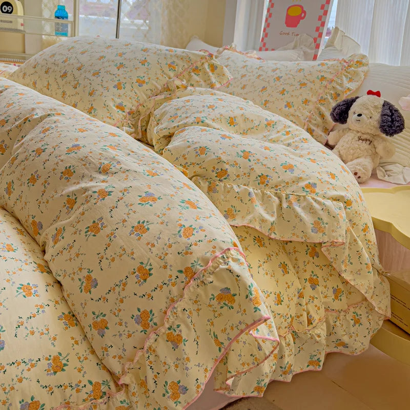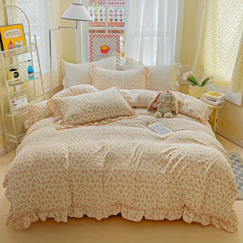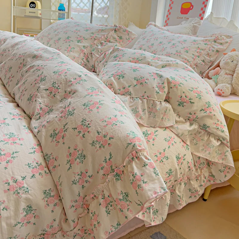 Korean Princess Style Floral Ruffles Bedding Set Washed Cotton Skin-friendly Soft Duvet Covers Set Bed Sheet Pillowcases 3/4Pcs