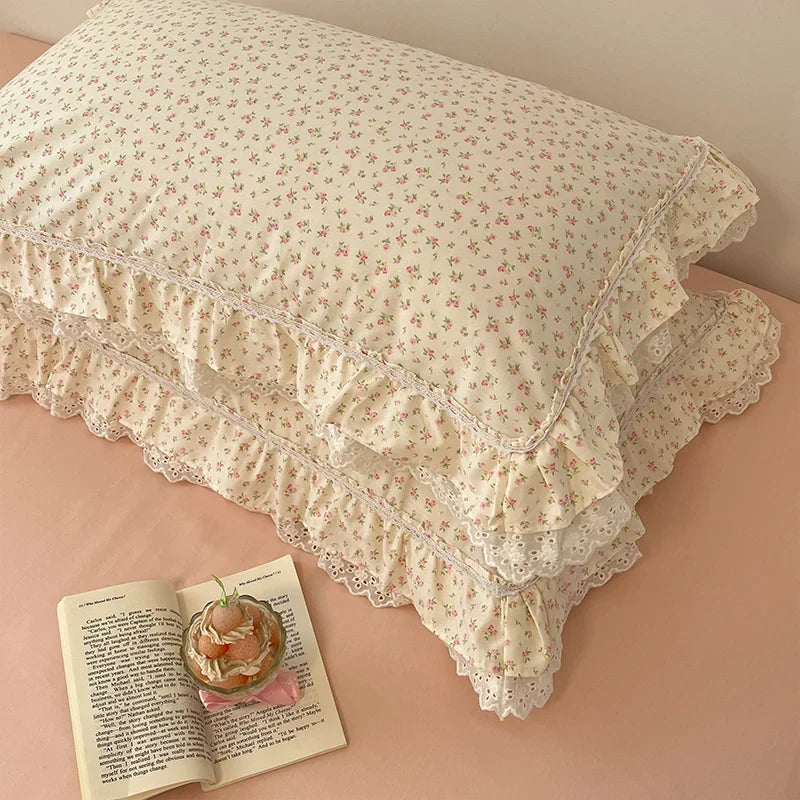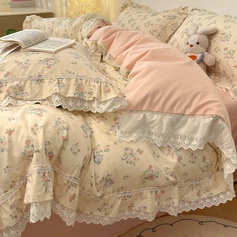 Korean Princess Style Flowers Lace Ruffles 100% Cotton Bedding Set Duvet Cover Bed Sheet/Fitted Sheet/Bed Skirt Pillowcases 4Pcs
