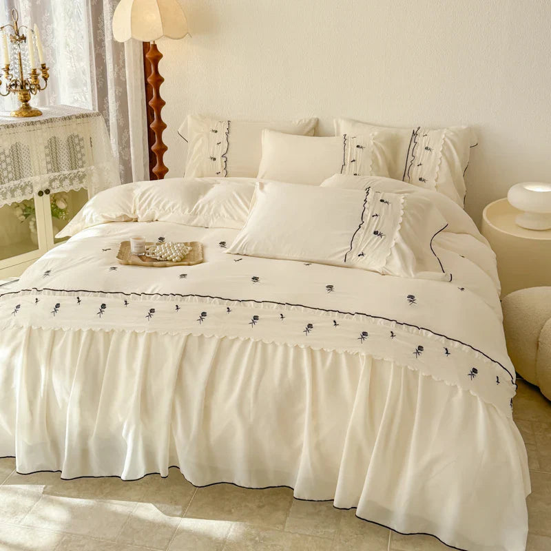 Korean Princess Style Lace Ruffles Rose Embroidery Wedding Bedding Set Duvet Cover Set Flat/Fitted Bed Sheet Pillowcases 4Pcs