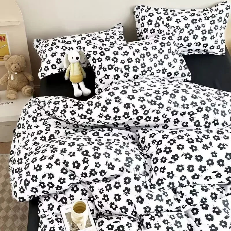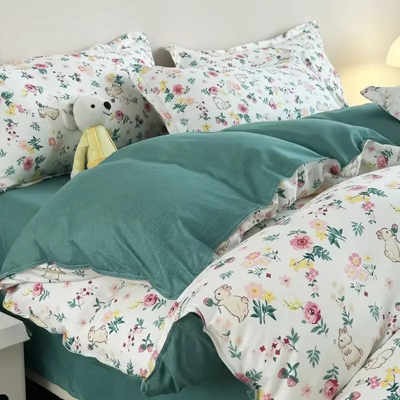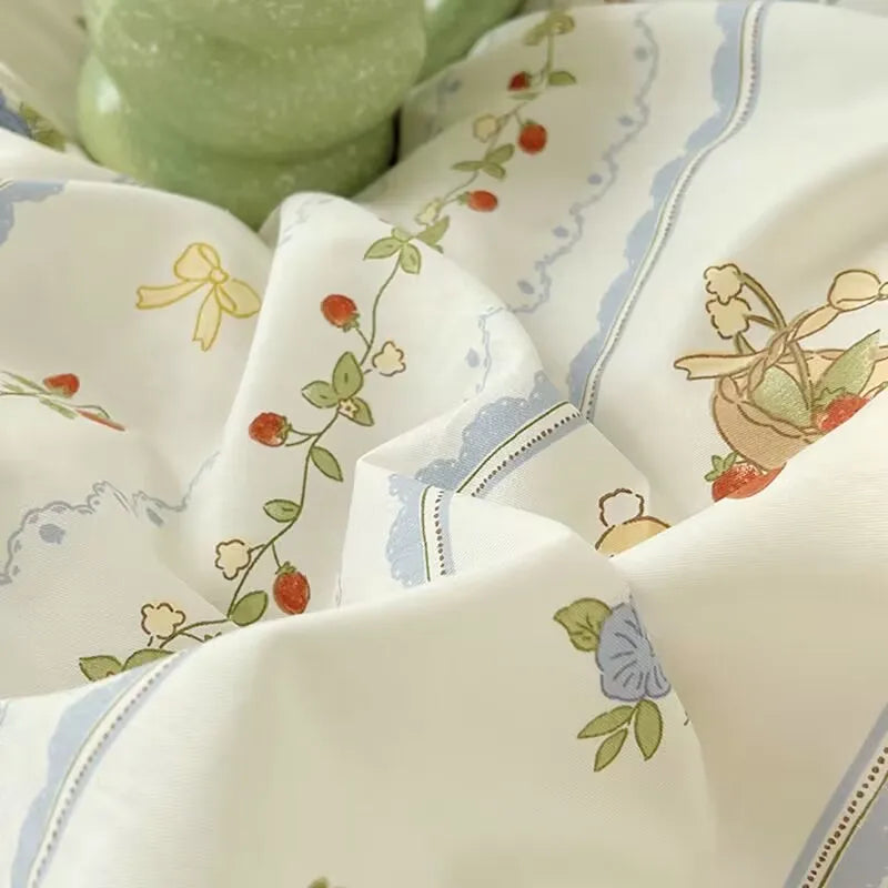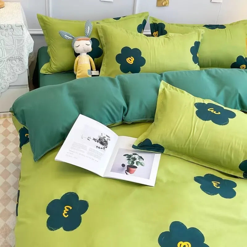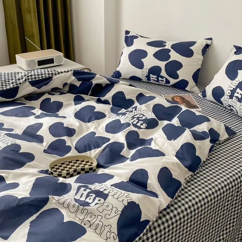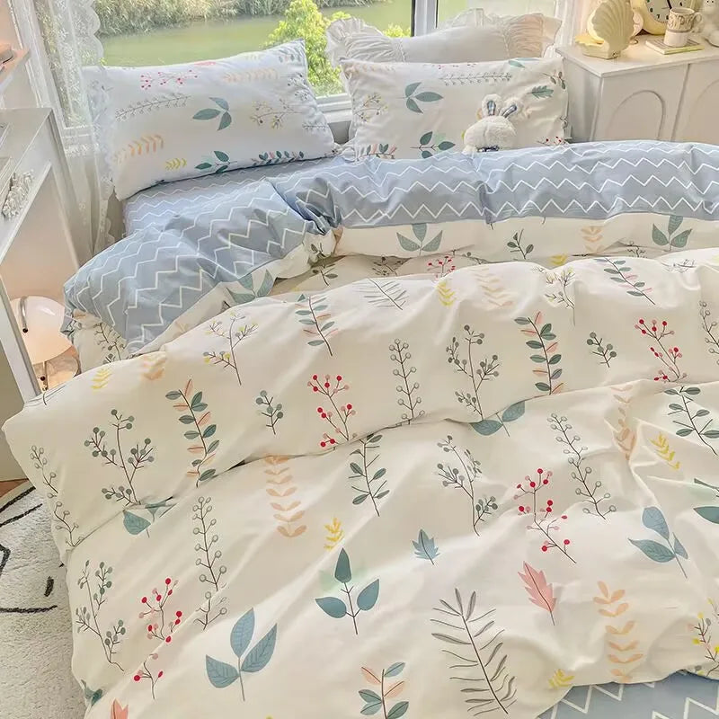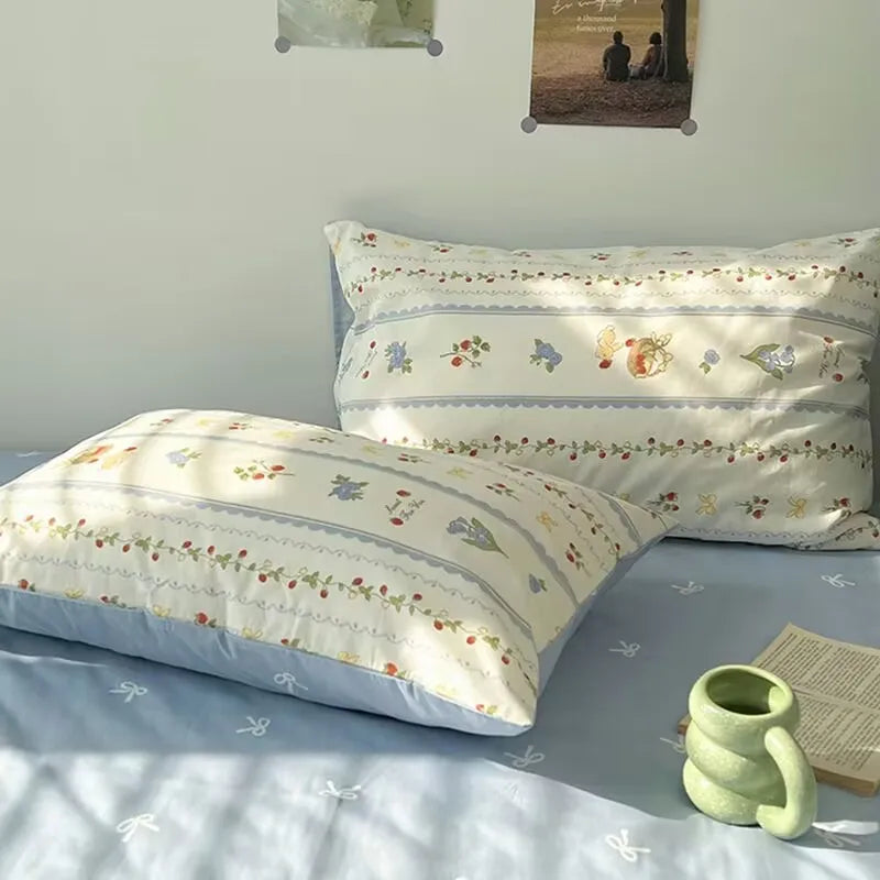 Korean Style Fashion Bedding Set Kids Adults Twin Full Queen Size Blue Bed Flat Sheet Duvet Cover Pillowcases Floral Bed Linen