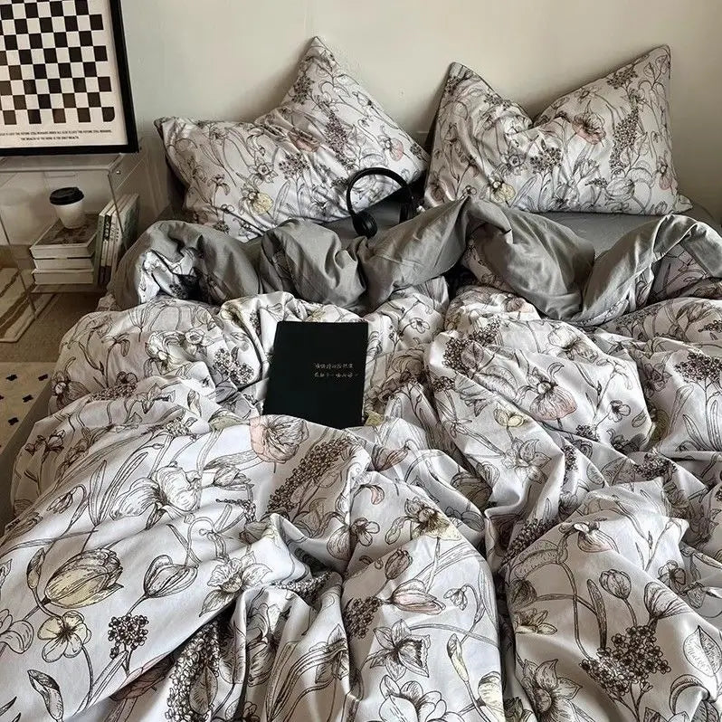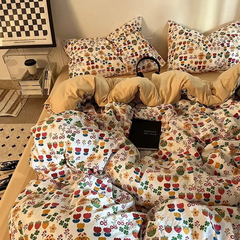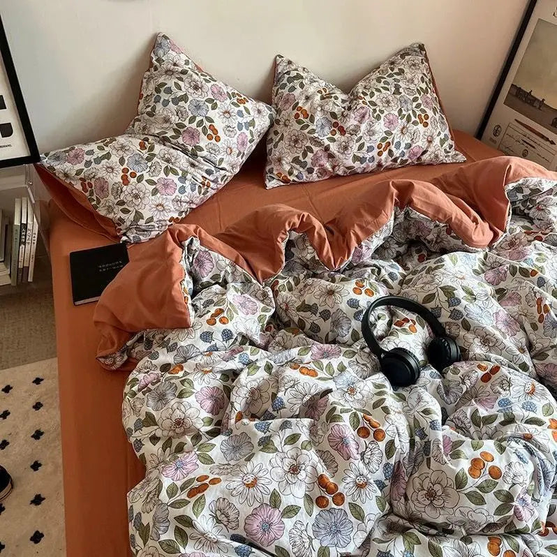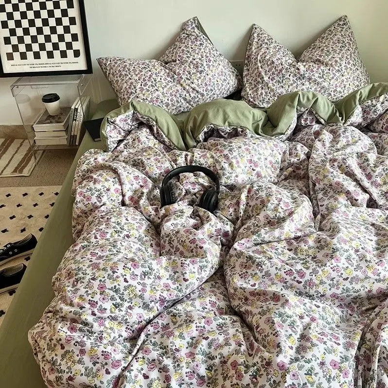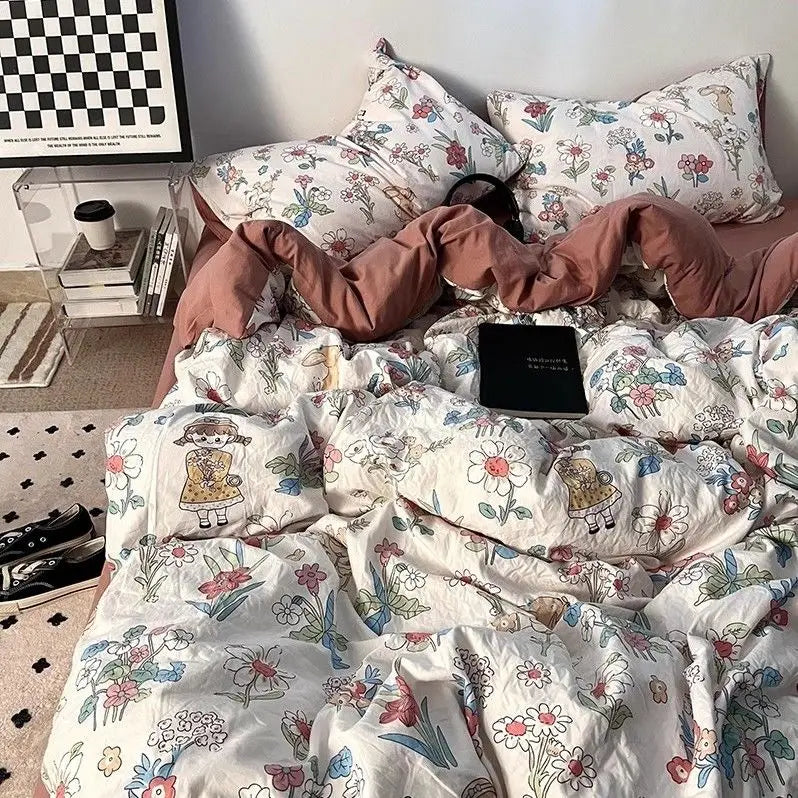 Korean Style Ins Retro Fresh Floral Washed Cotton Bed Four Piece Duvet Set. Student Dormitory Bed Sheet Three Piece Set