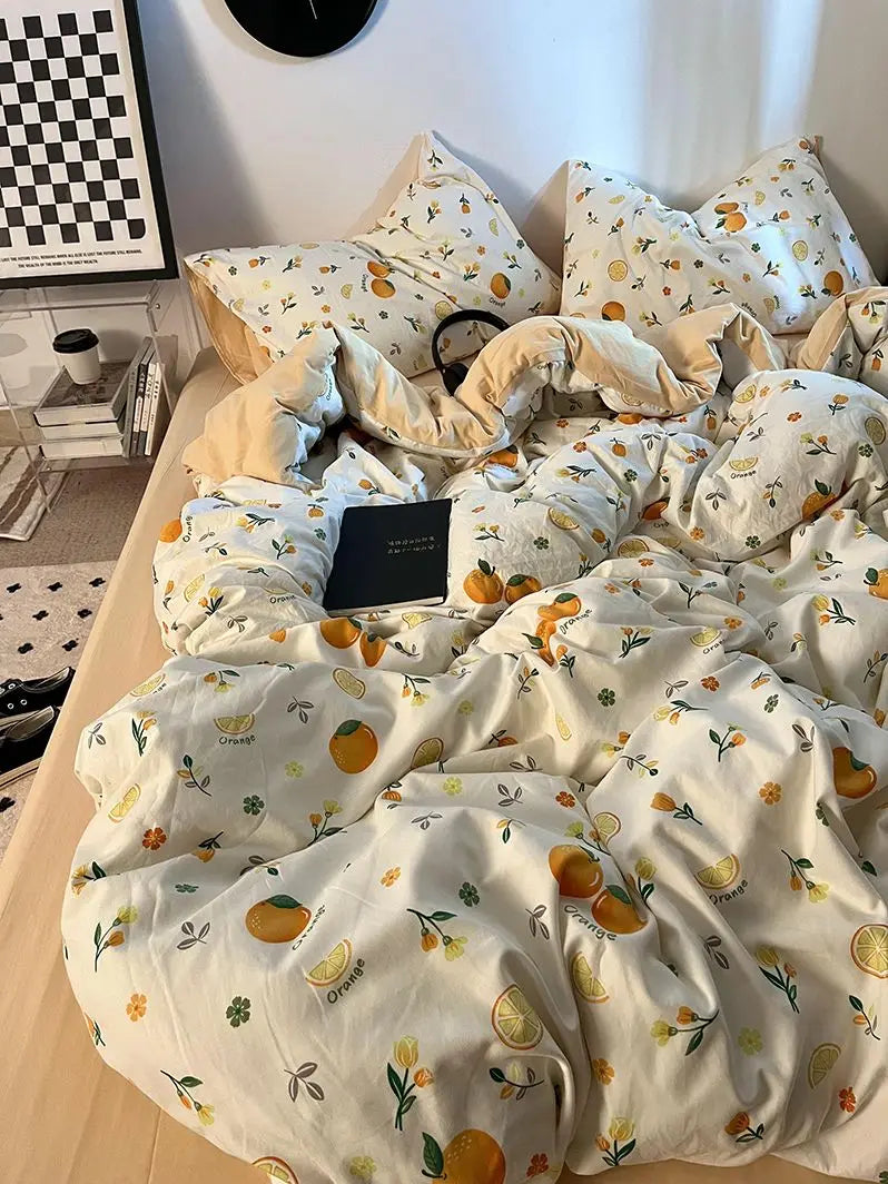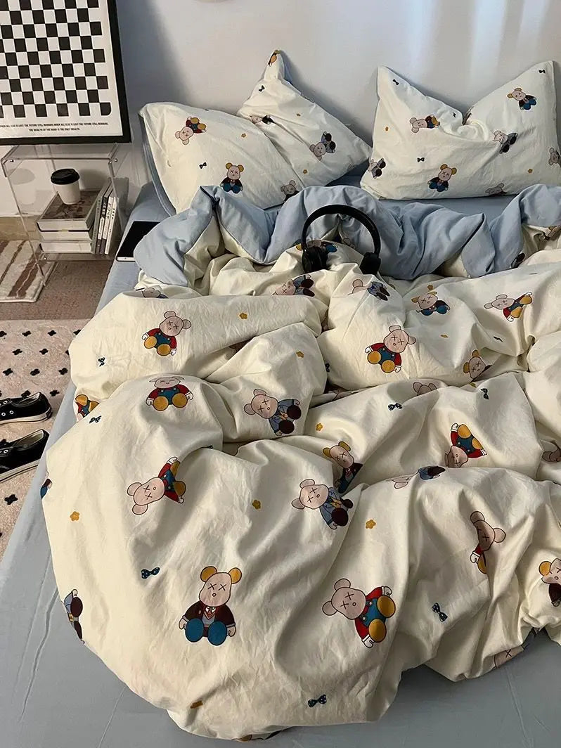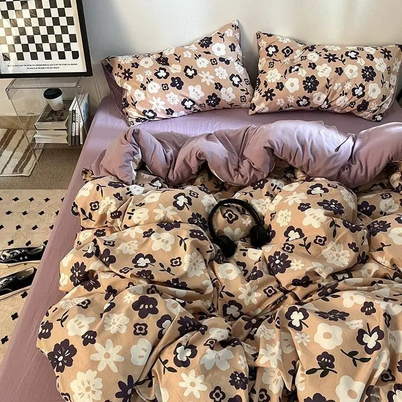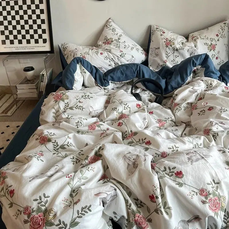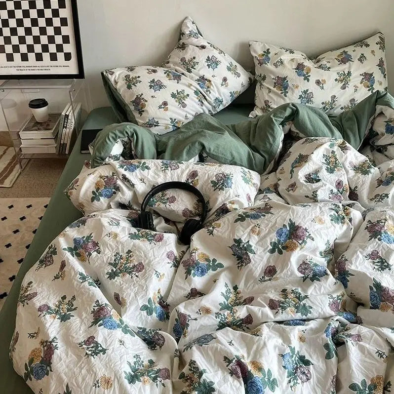 Korean Style Ins Retro Fresh Floral Washed Cotton Bed Four Piece Duvet Set. Student Dormitory Bed Sheet Three Piece Set