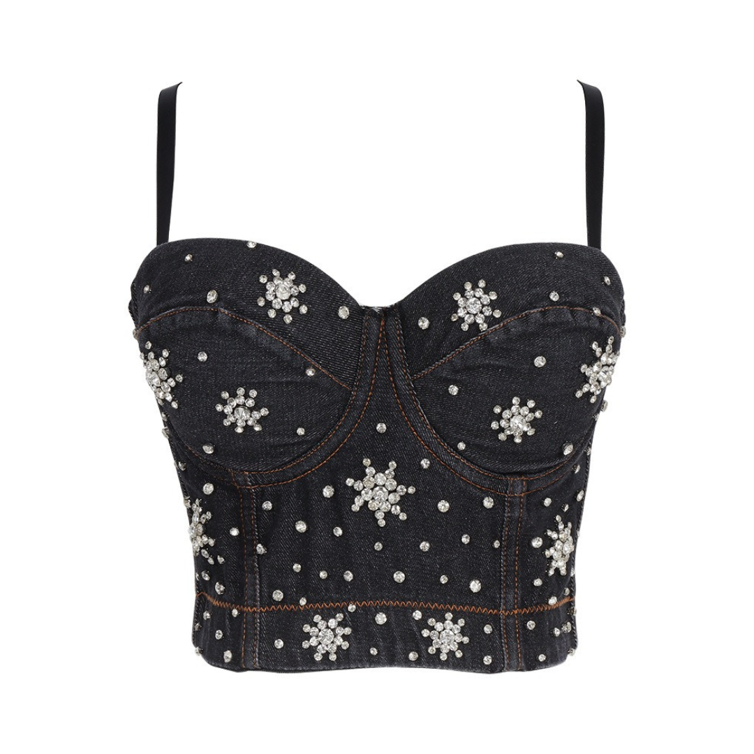 This exquisite Denim Underwear is expertly adorned with sparkling Rhinestones. elevating your lingerie game to a whole new level. The low chest design offers a sexy and daring look. while the soft denim material provides comfort and durability.