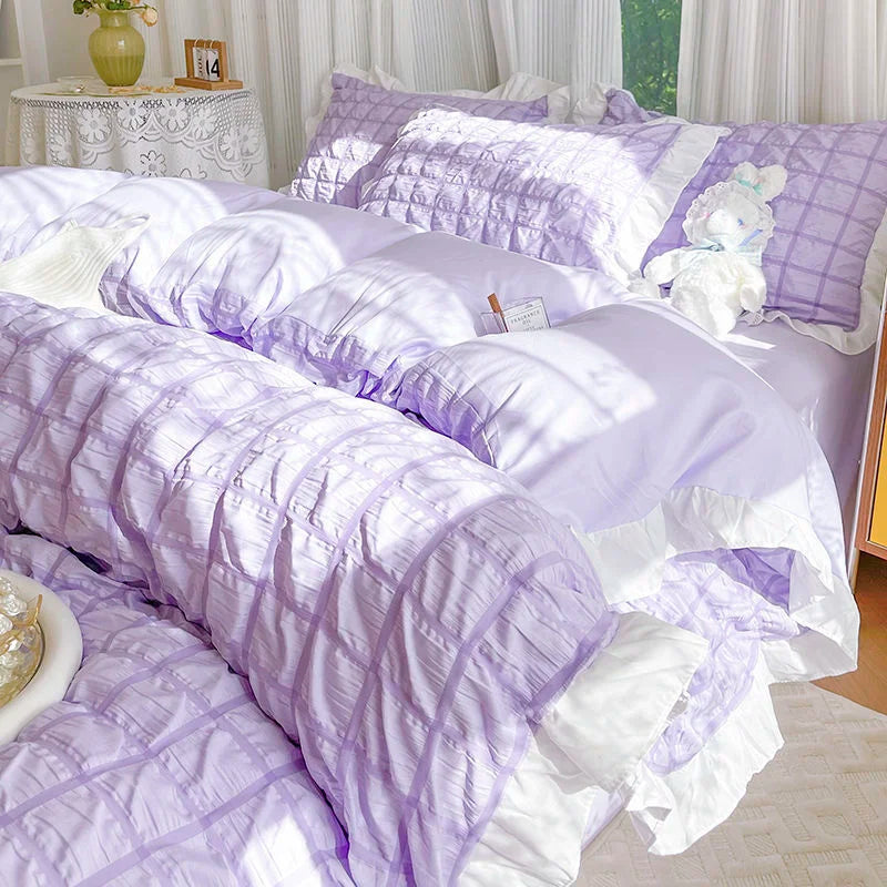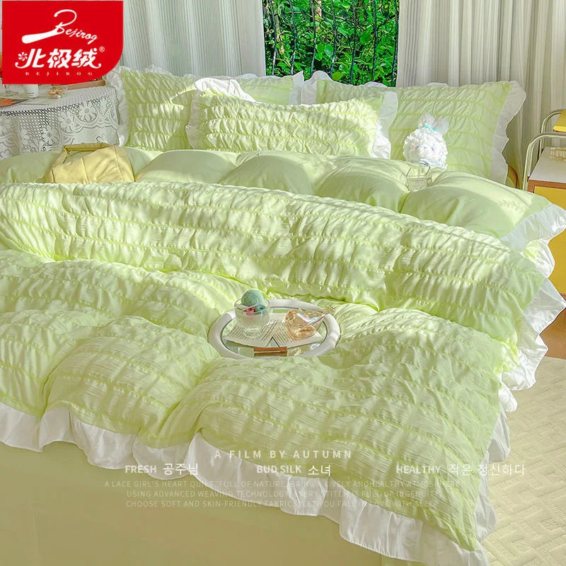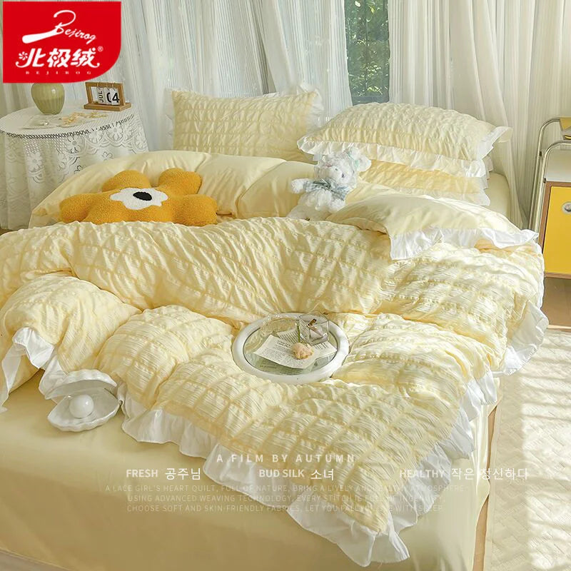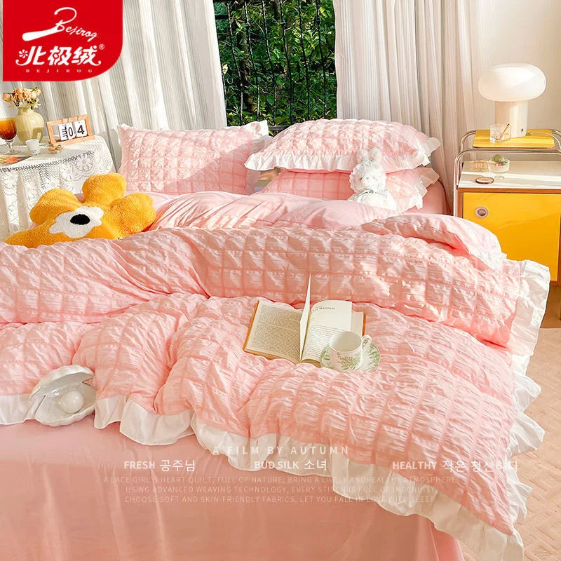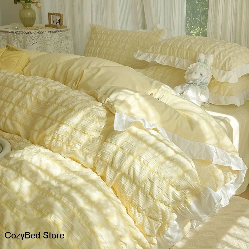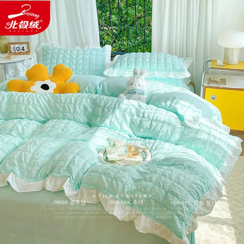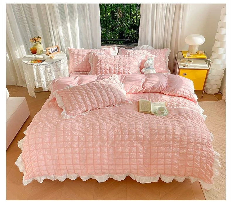 Luxury Seersucker Washed Cotton Bedding Set INS Girls Princess Bedding Set with Lace Solid color Bedclothes Sheets Pillowcase