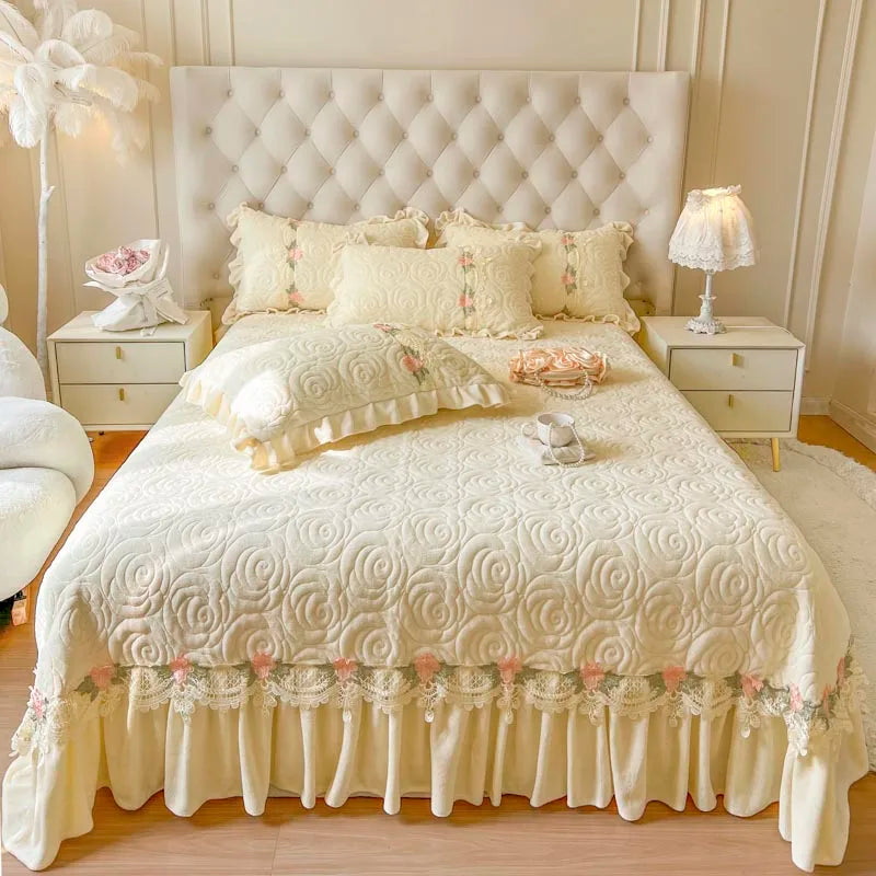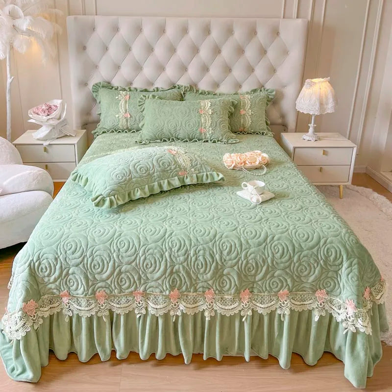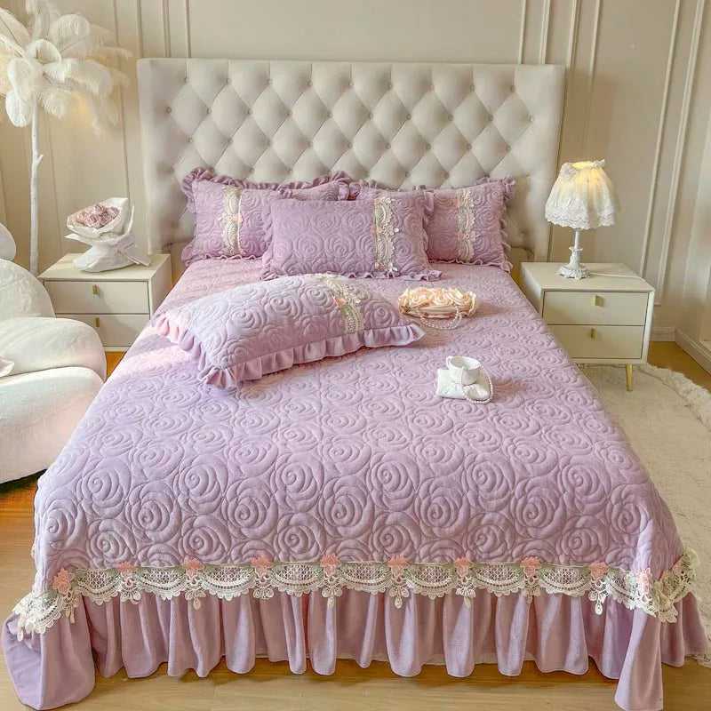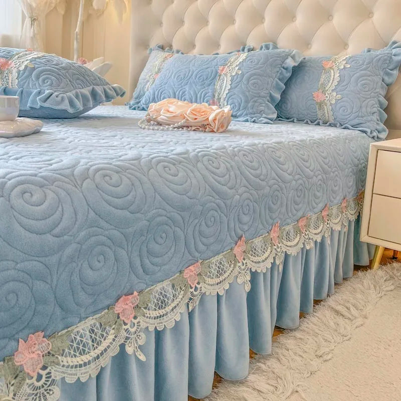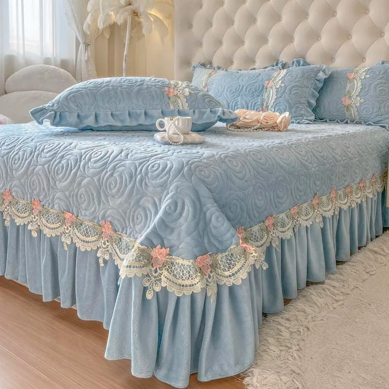 Luxury Velvet Fleece Flowers Lace Ruffles Quilted Bedspread. Mattress Cover. Bed Skirt. Bed Sheet Set. With Pillowcases. 3Pcs