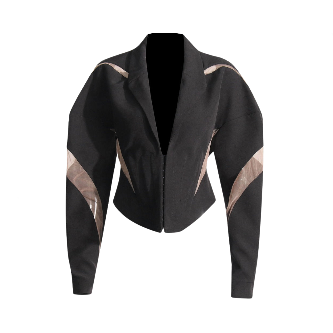 This blazer features a modern mesh splicing and a flattering curved hem design. Its long sleeves provide added coverage and a sleek silhouette. P