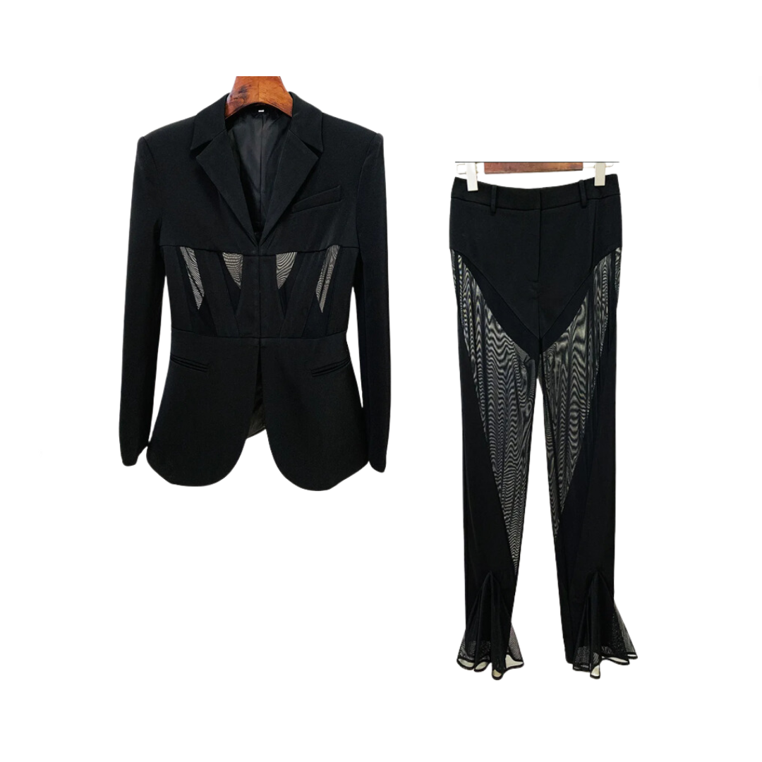The breathable mesh splicing adds a touch of elegance to your outfit. making you stand out in any setting. Crafted with a slim fitted blazer and flare pants. this ensemble creates a flattering silhouette for any body type.