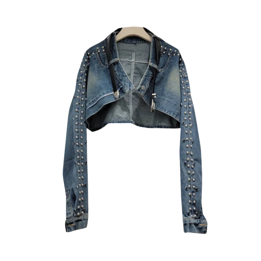 This Metal Rivet Washed Denim Short Jacket adds a touch of edginess to any outfit. The metal rivets add a unique detail. while the washed denim creates a cool. casual vibe.