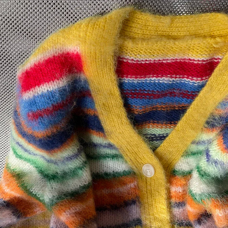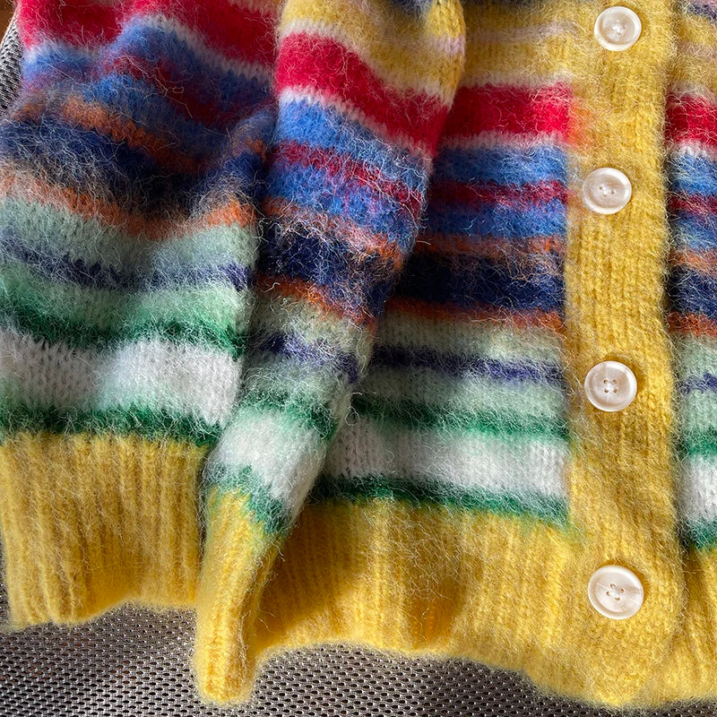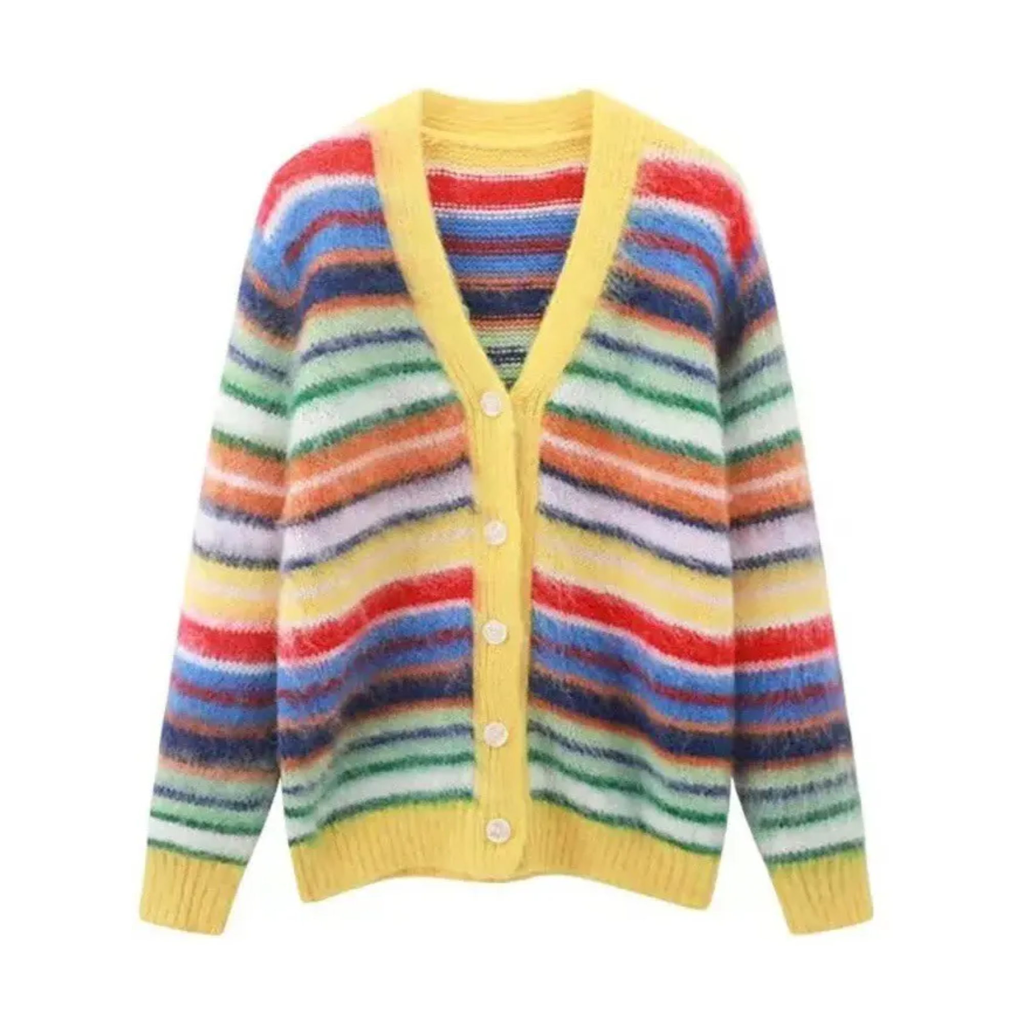 Stay cozy and stylish with our Multicolor Striped Long Sleeves V-Neck Cardigan Sweater. This button-up cardigan features a fuzzy and ribbed design. with vibrant rainbow stripes perfect for adding a pop of color to your autumn/winter wardrobe.