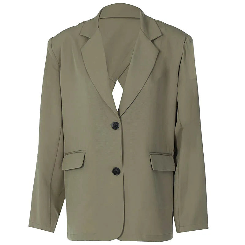 The jacket features a unique open back design. providing a modern twist on a classic piece. With long sleeves and a loose fit. it offers both coverage and freedom of movement.