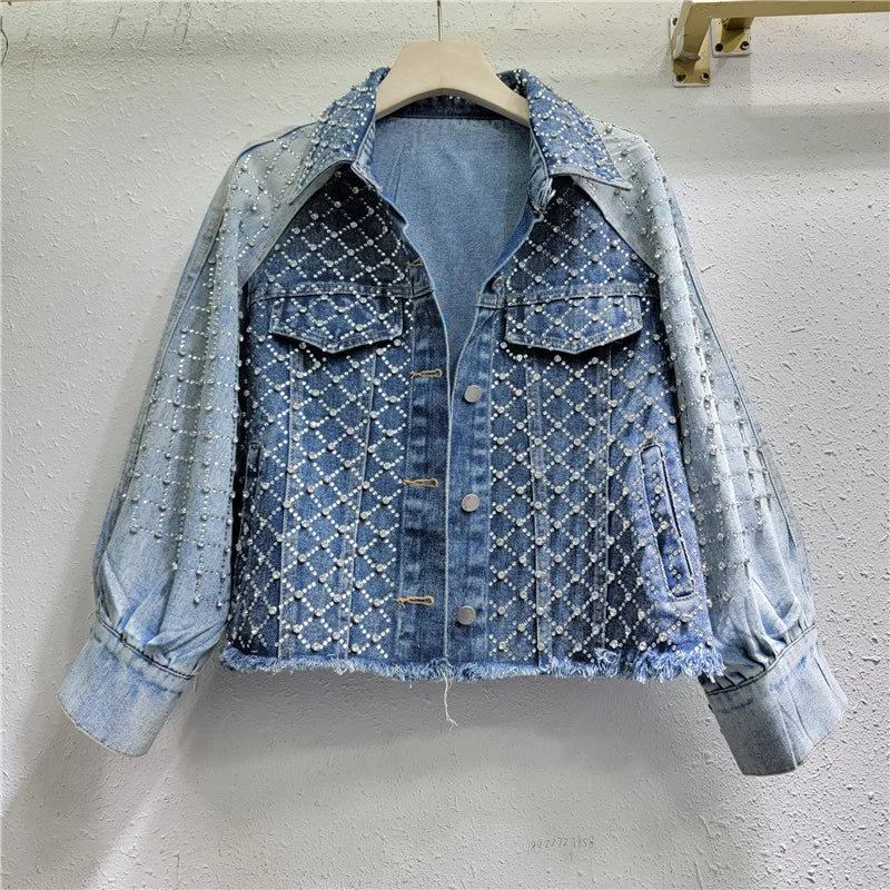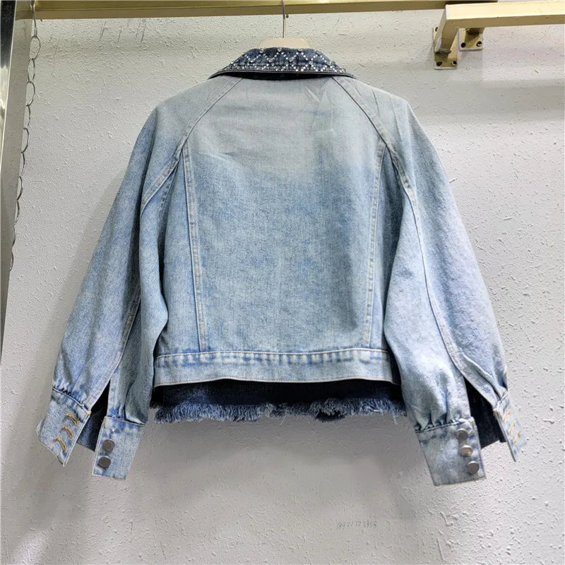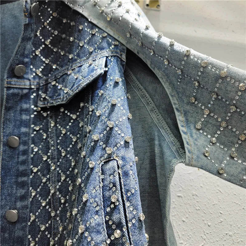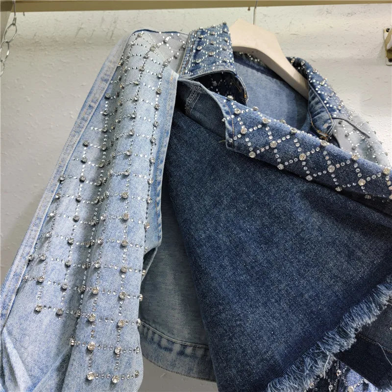 This stylish and durable jacket features a unique patchwork design with hot drilling diamond details. Made from washed denim. it's perfect for adding an edgy touch to any outfit while keeping you warm and comfortable.