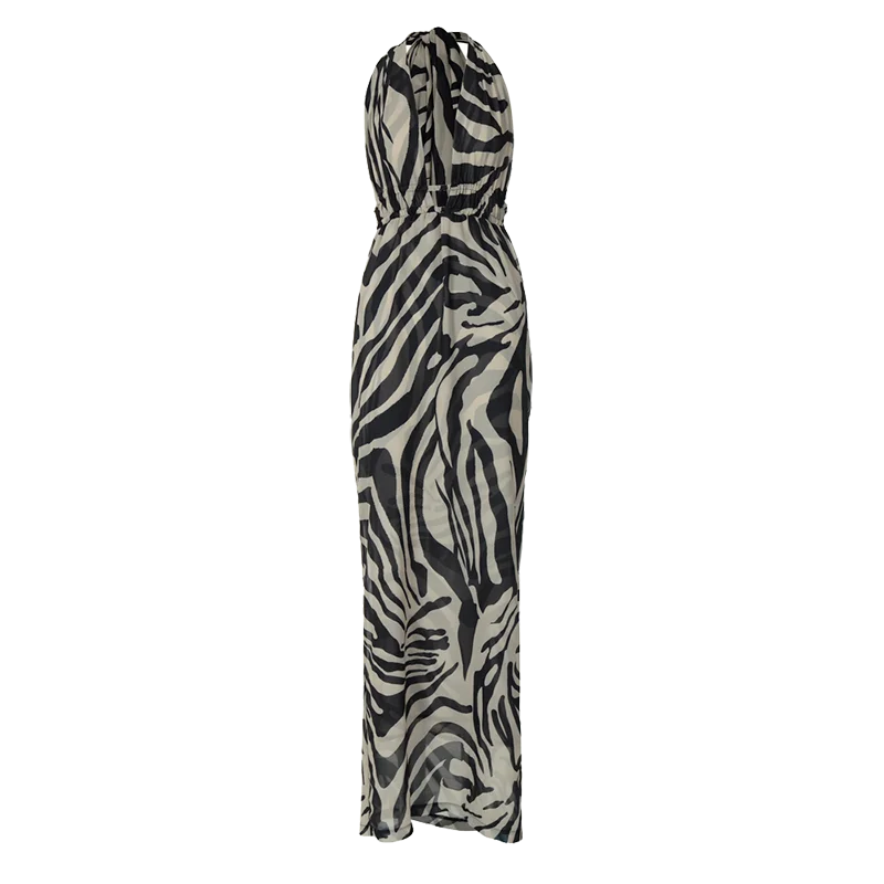 With its unique patchwork design. plunging V-neckline. and backless cut. this dress is sure to turn heads. The lace-up detail adds a touch of elegance. making it perfect for any occasion.