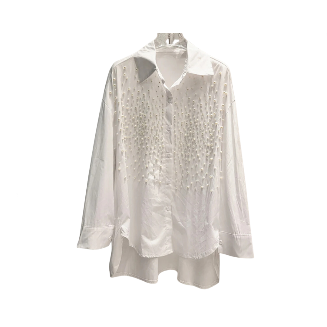 This Pearl Studded Solid Loose Casual Blouse adds a touch of elegance to your wardrobe. The pearl detailing adds a classic element to the solid. loose design for a timeless look.