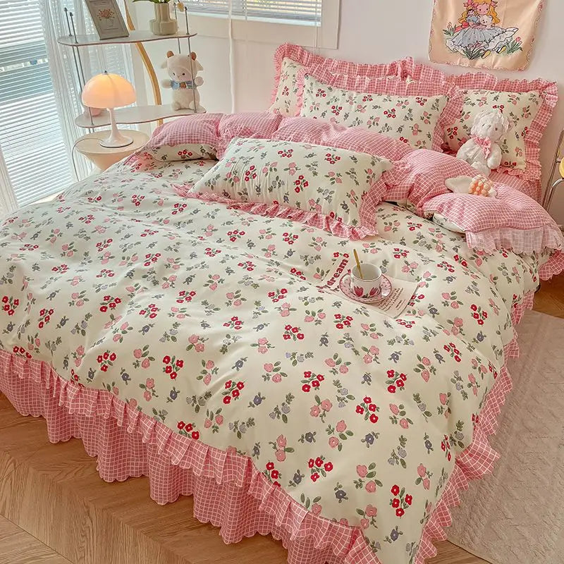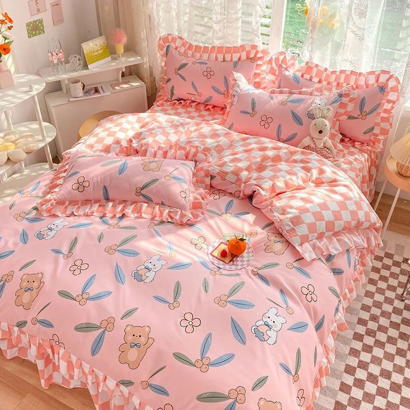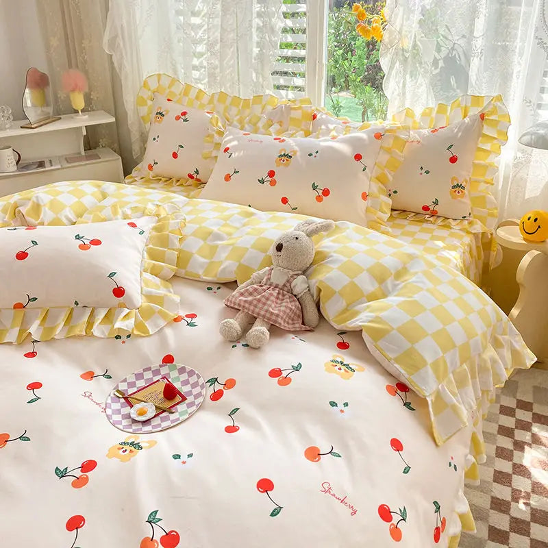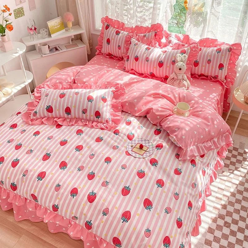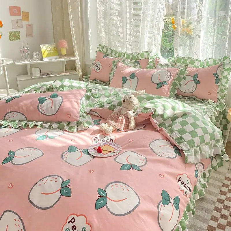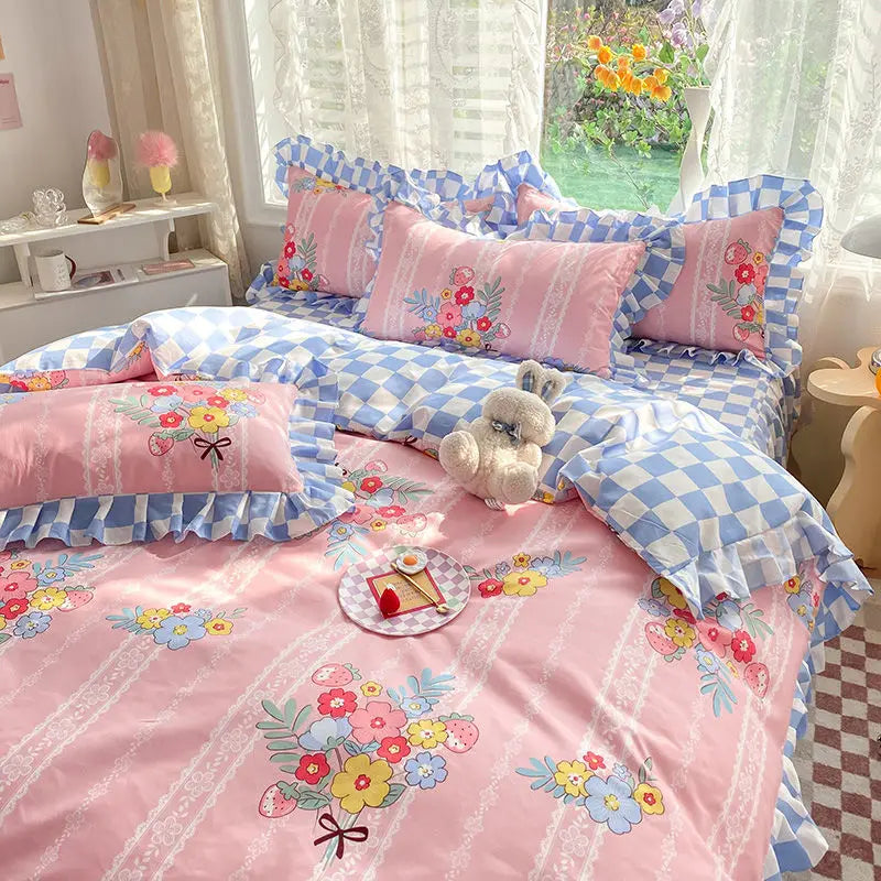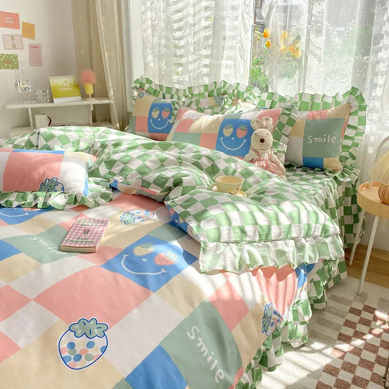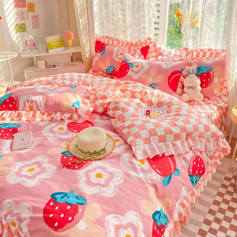 Pink Korean Princess Bedding Set No Filling Cute Strawberry Duvet Cover Checkerboard Single Queen Size Bed Linen Pillowcases