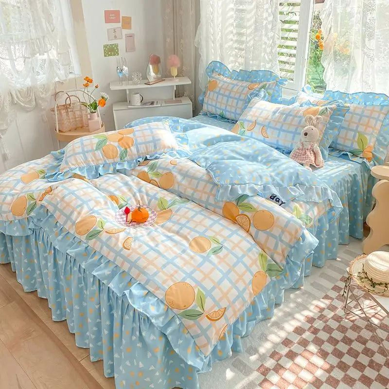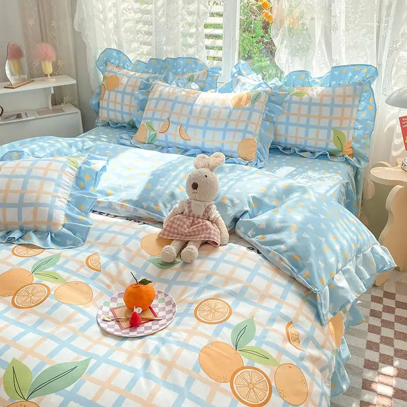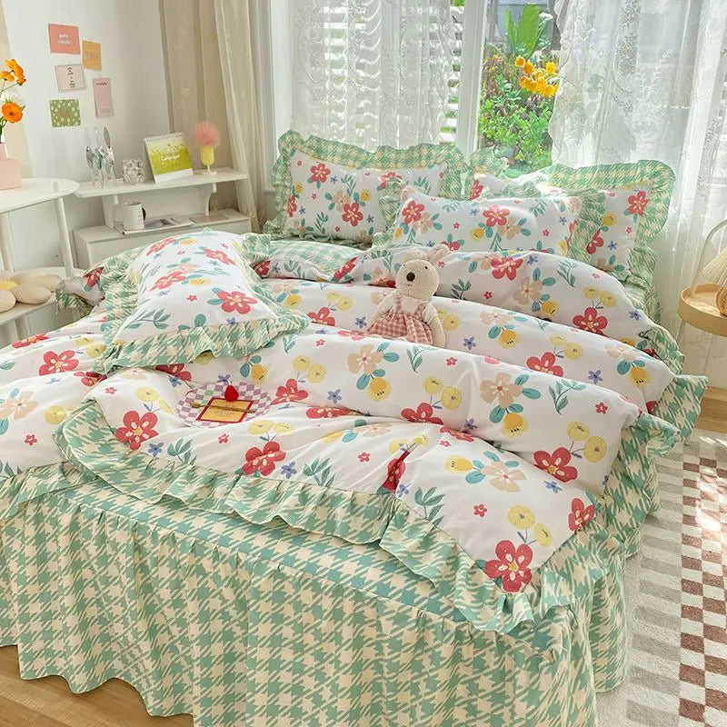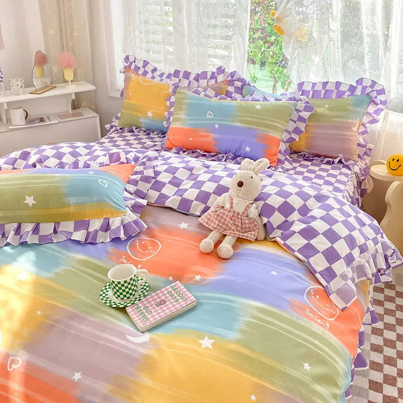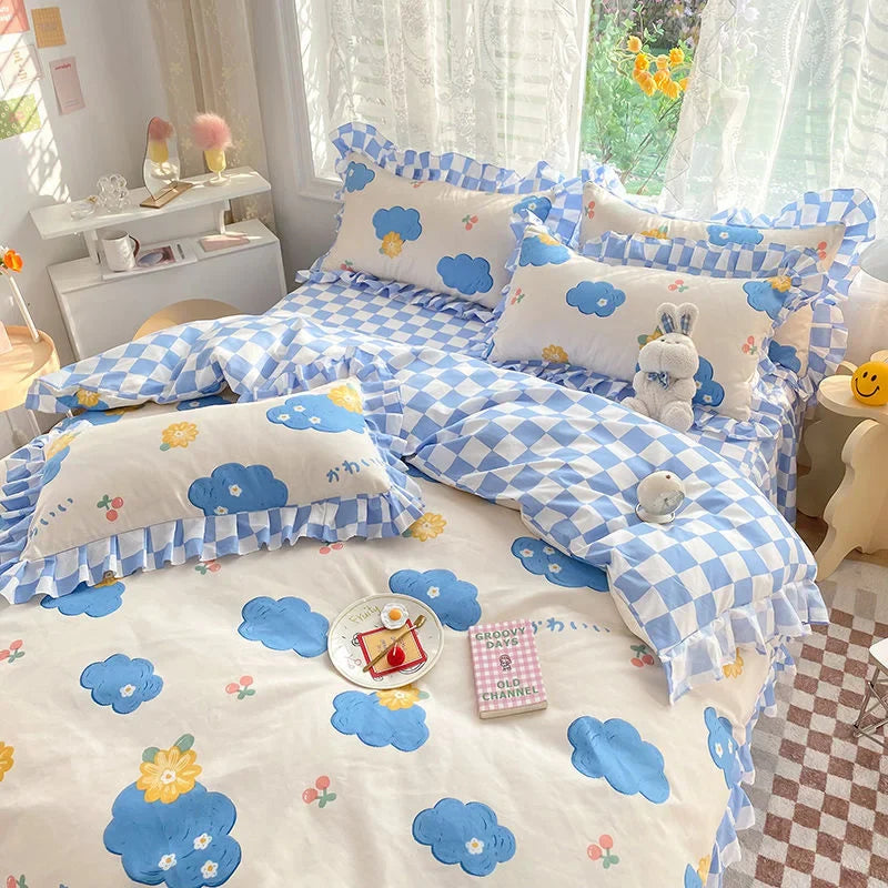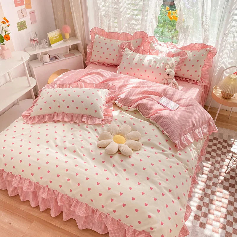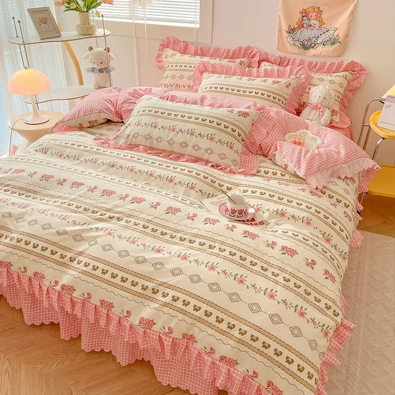Pink Korean Princess Bedding Set No Filling Cute Strawberry Duvet Cover Checkerboard Single Queen Size Bed Linen Pillowcases