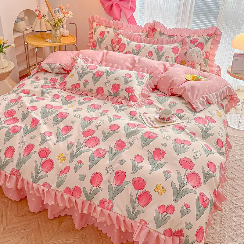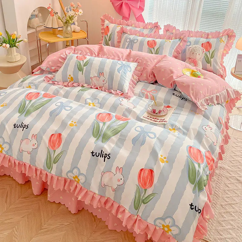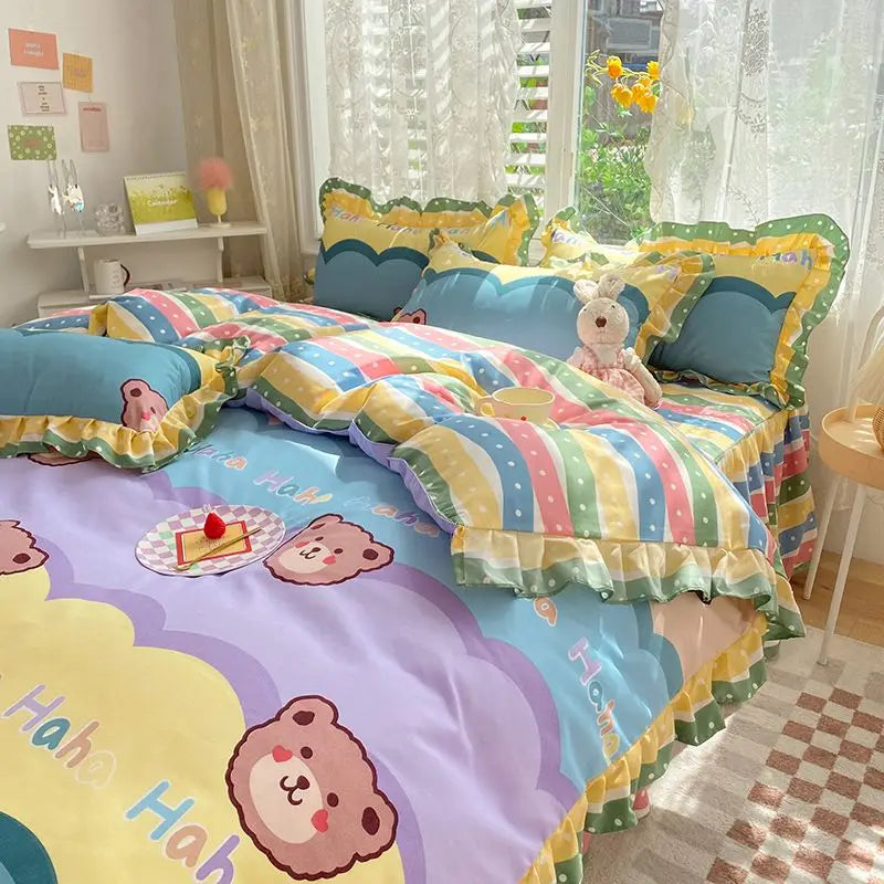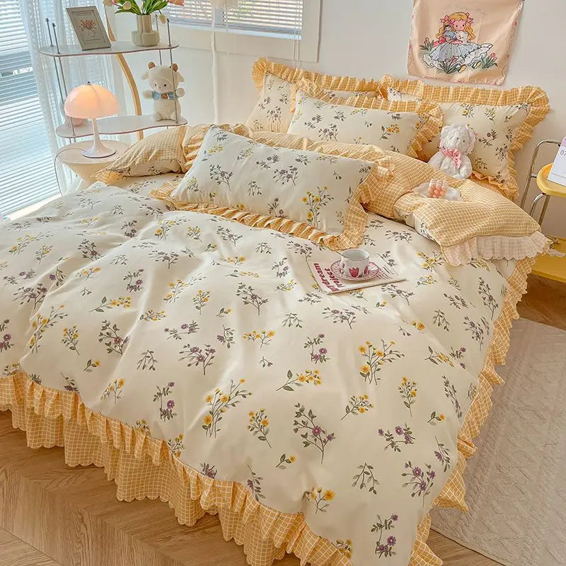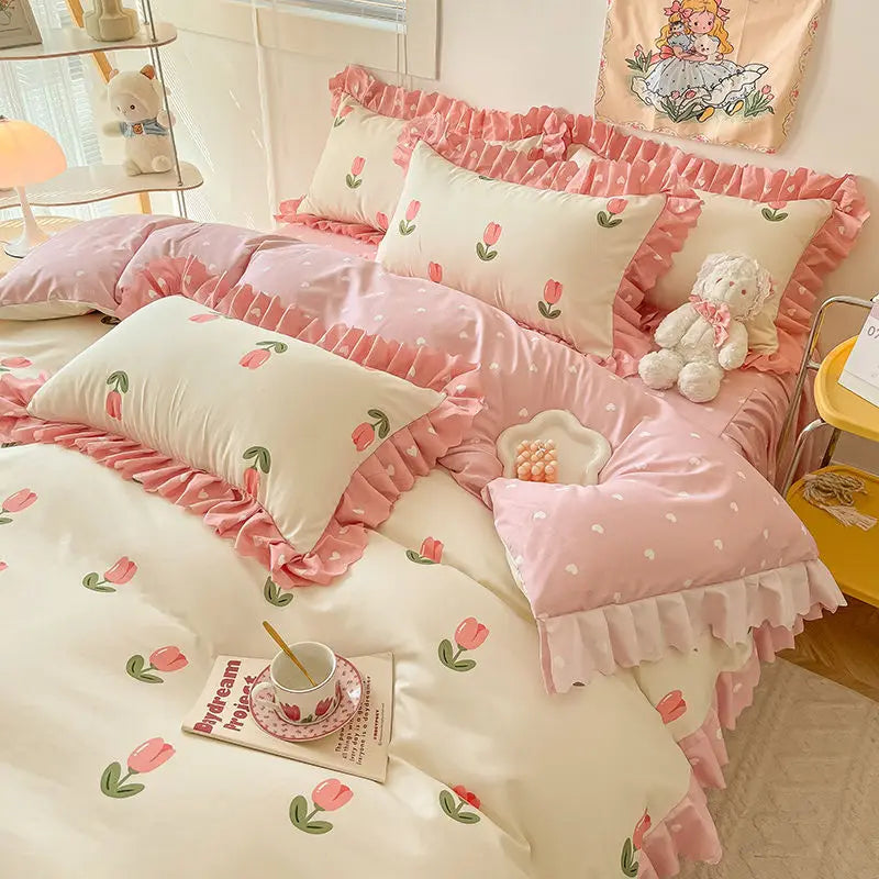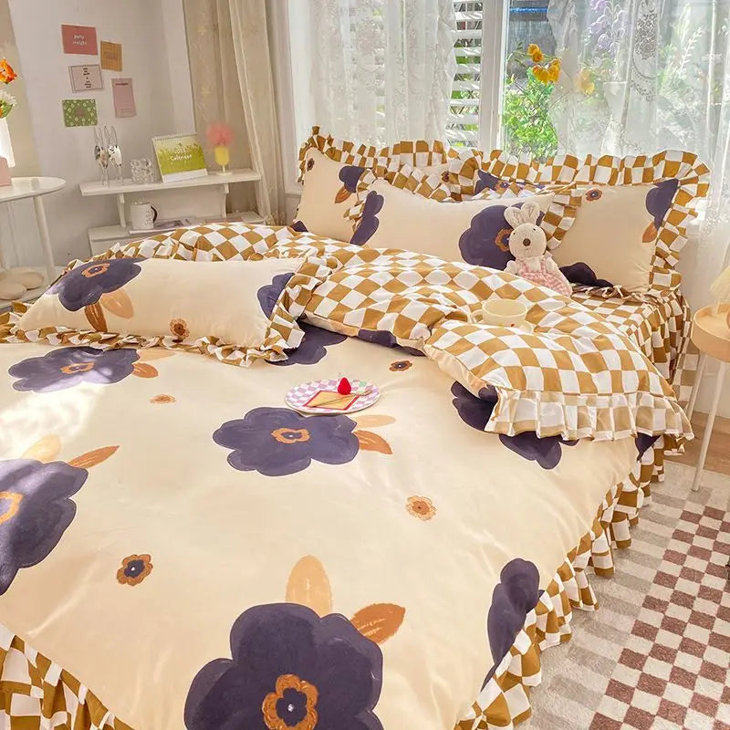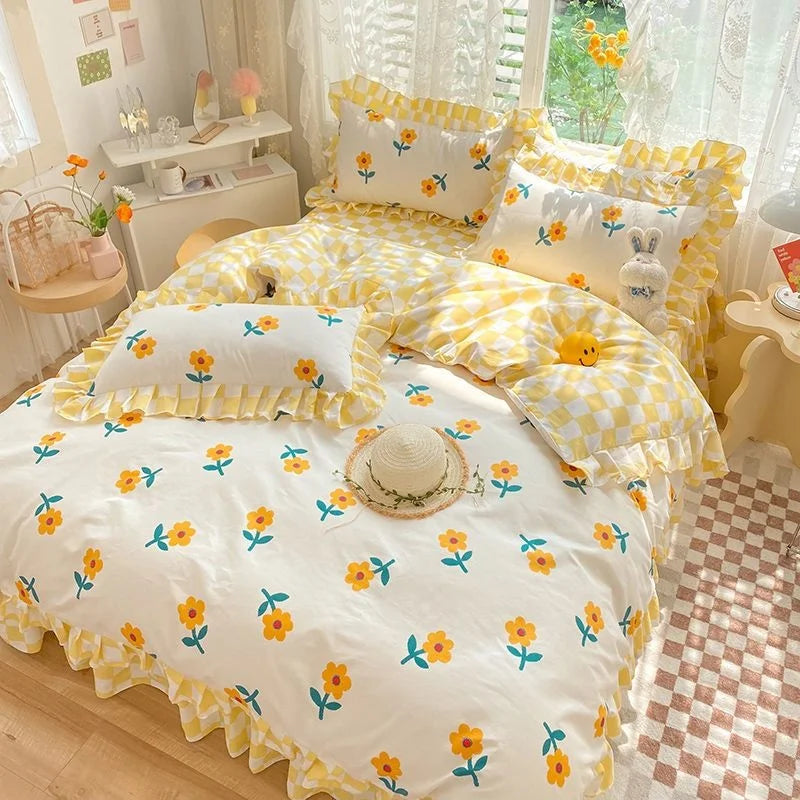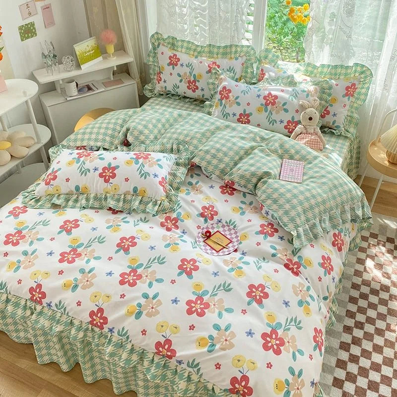 Pink Korean Princess Bedding Set No Filling Cute Strawberry Duvet Cover Checkerboard Single Queen Size Bed Linen Pillowcases