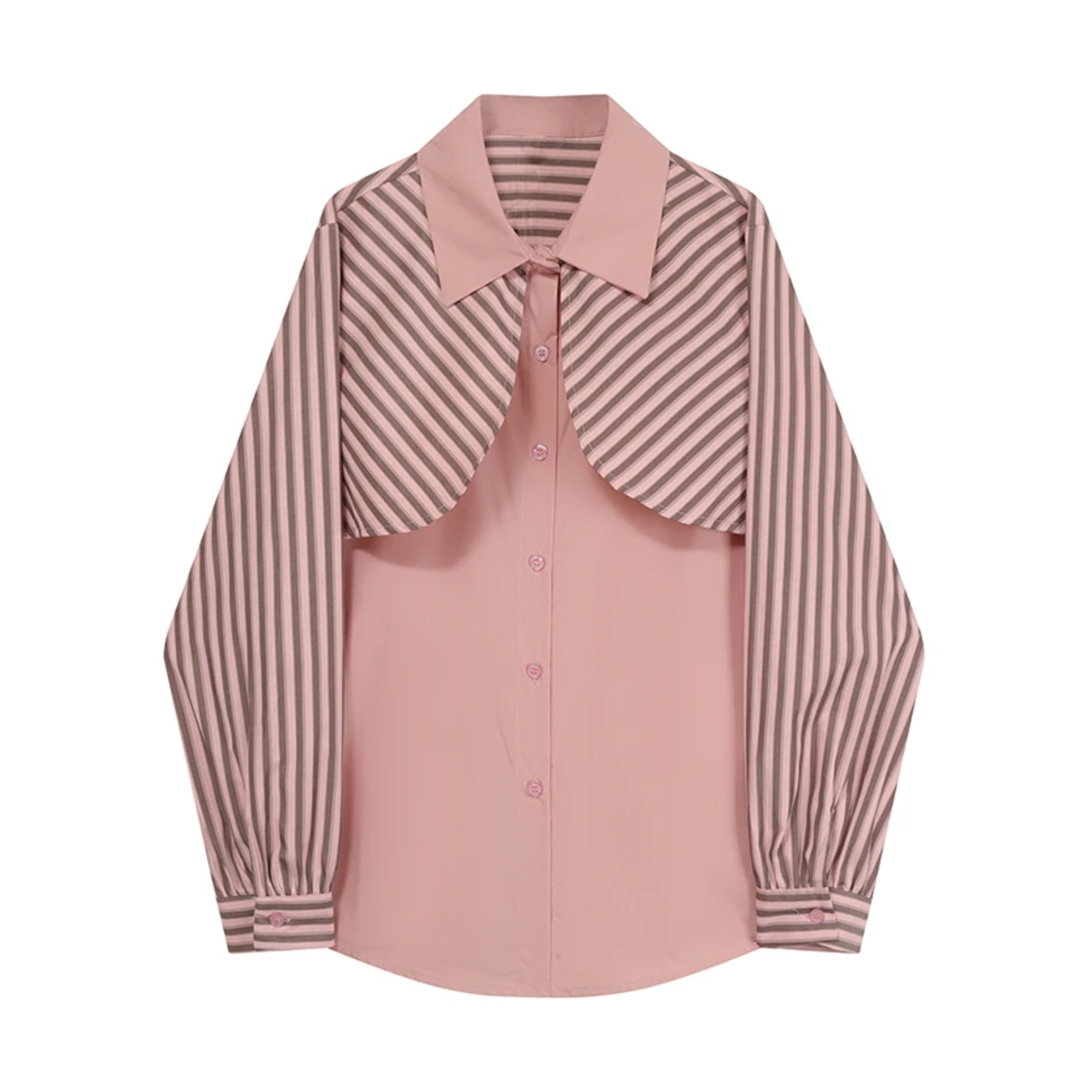 Expertly crafted. this Pink Stripes Spliced Top boasts a turn-down collar. fake two-piece design. and long sleeves. Made with high-quality materials. it offers both fashion and comfort. This versatile blouse is perfect for any occasion. providing a vintage feel with a modern touch.