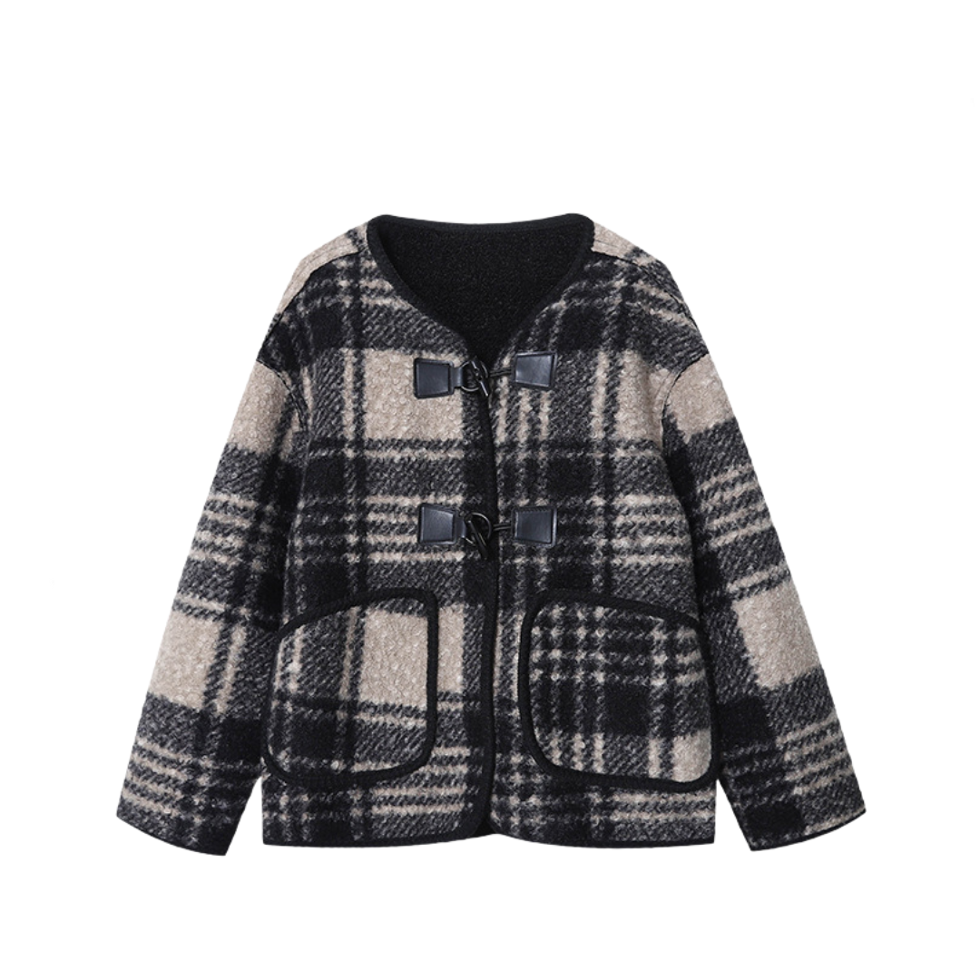 Made with wool. this coat is both warm and lightweight. The plaid pattern adds a touch of sophistication while the loose fit provides comfort and ease of movement.
