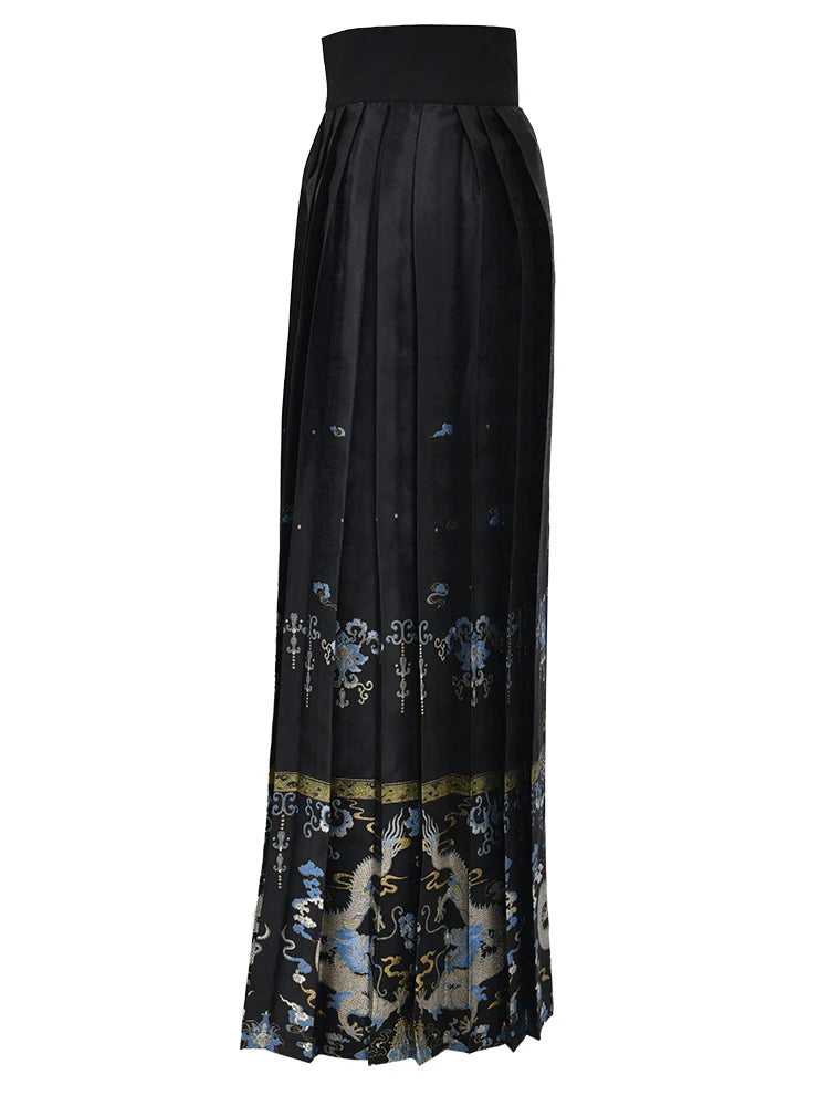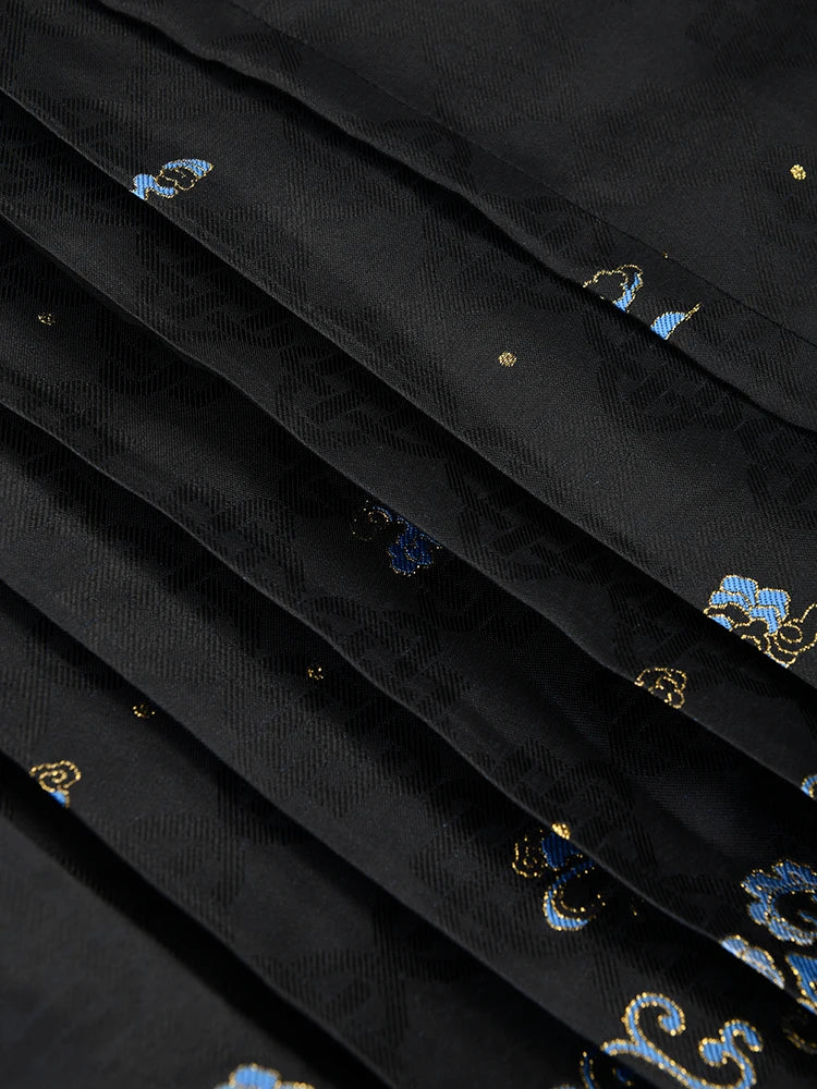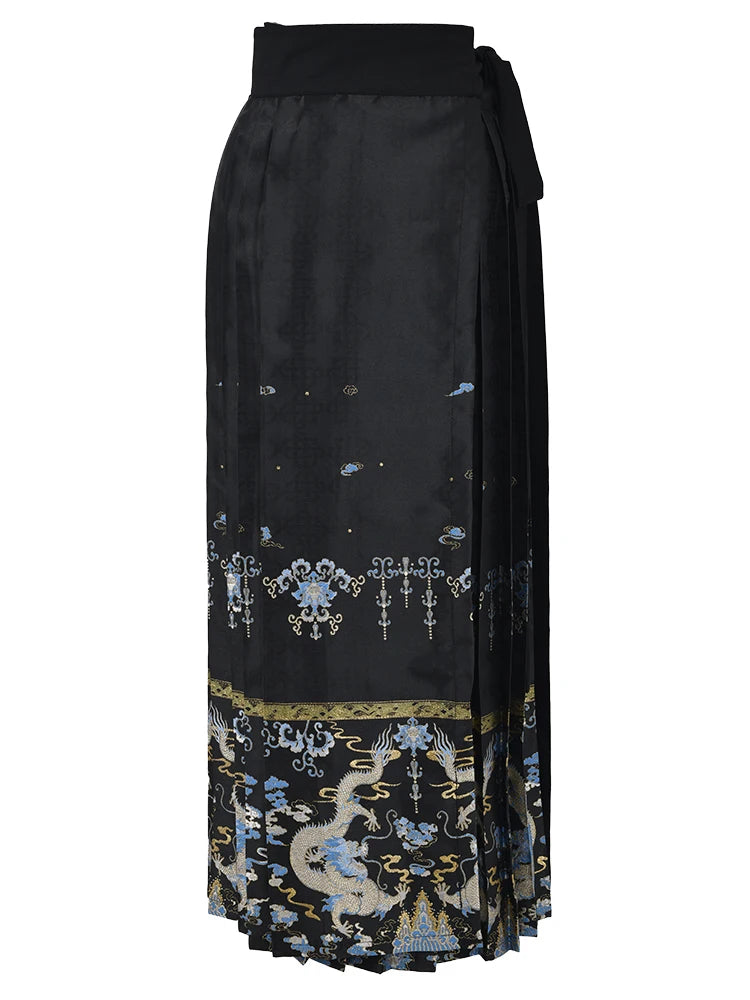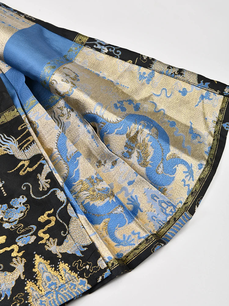 Made with a unique dragon jacquard pattern. this skirt is a perfect fusion of elegance and edge. Its pleated design and lace up detailing add texture and depth. making it a must-have for any fashion-forward wardrobe.