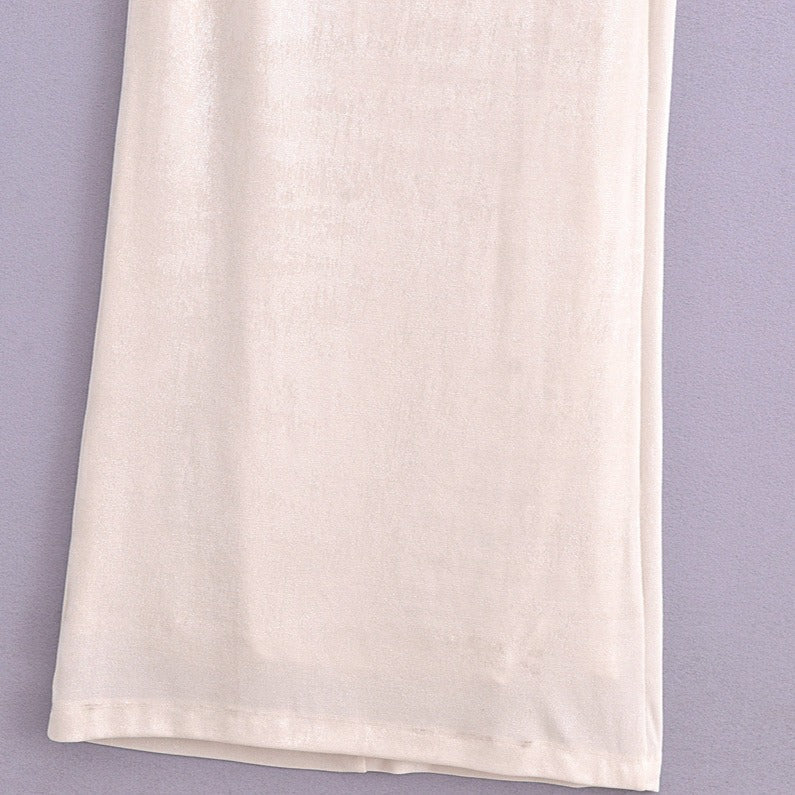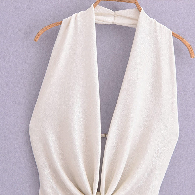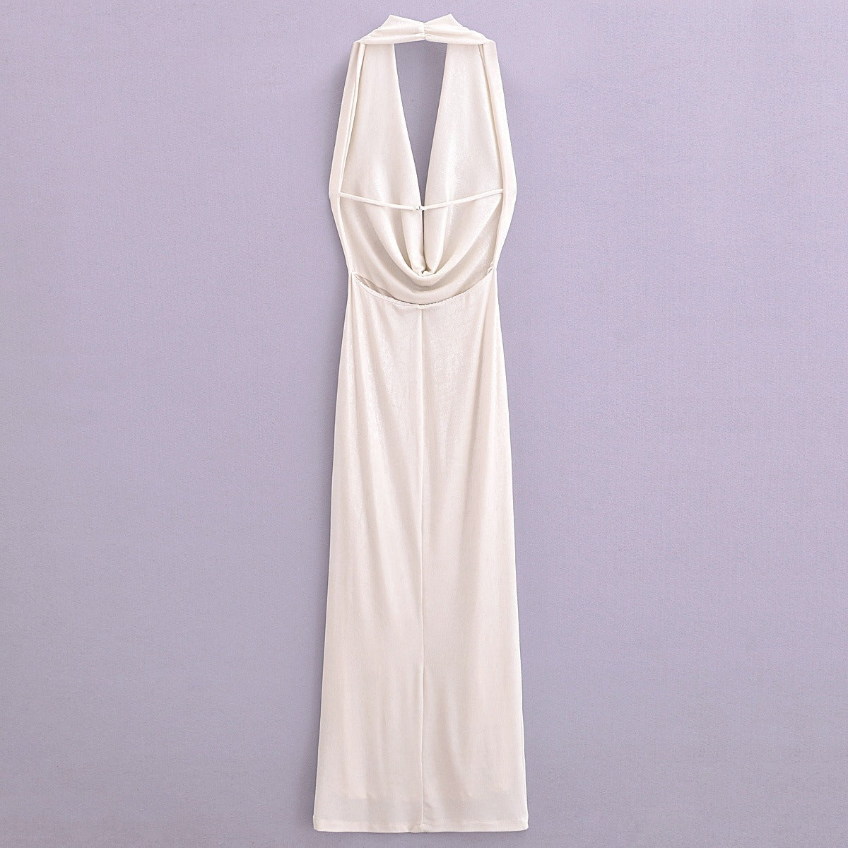 Its pleated design and backless style exude sophistication and femininity. The hanging neck adds a touch of glamour. while the long length elongates the body.