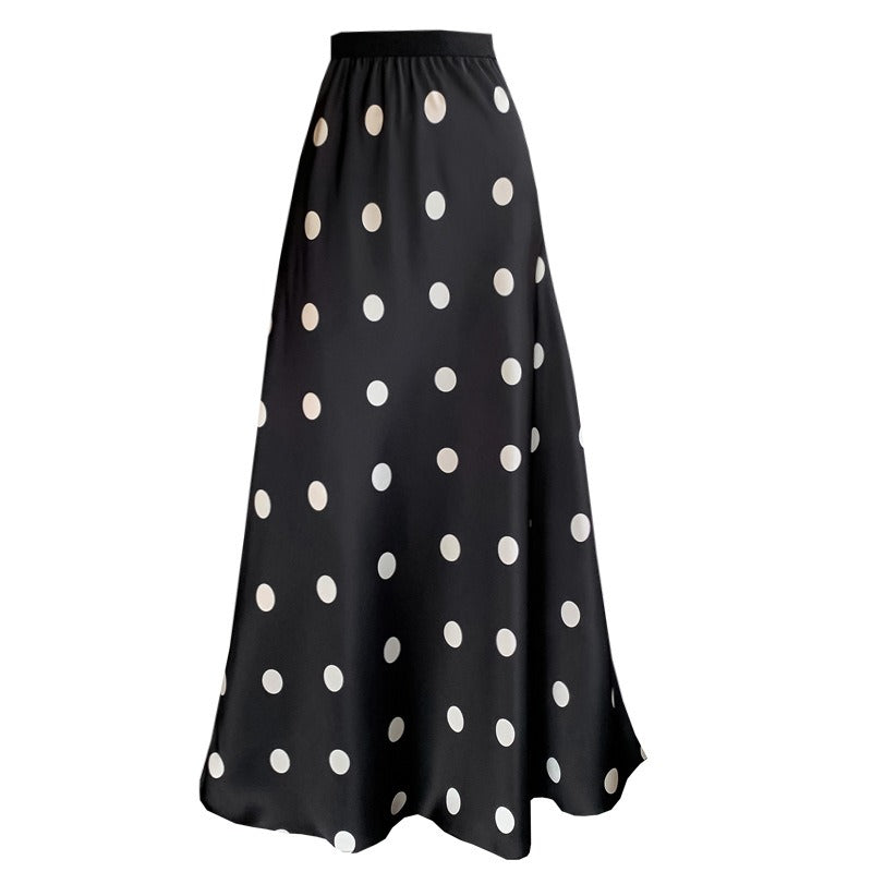 This polka-dot skirt is a must-have for any fashion-forward woman. Its draping high-waisted design and satin material create a flattering A-line silhouette with a fishtail hem.