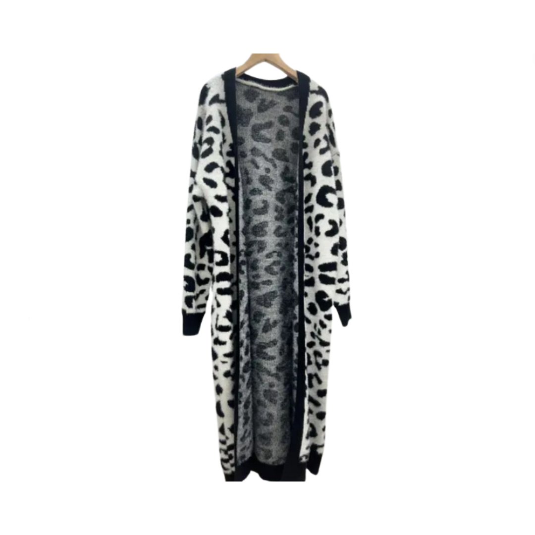 The thick. long. and loose knit design provides both warmth and style. Perfect for any occasion. this cardigan will elevate any outfit with its trendy animal print.