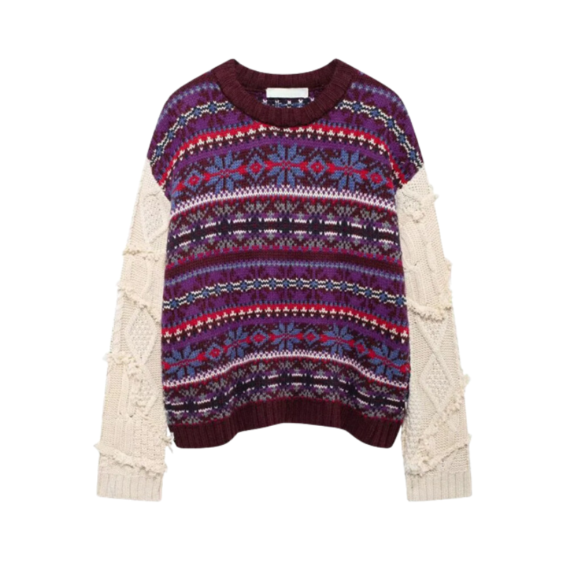 With its playful contrasting colors and unique jacquard design. this sweater is perfect for bringing fun and style to your cold-weather wardrobe. Its round neck and loose fit ensure comfort. while the intricate detailing adds an element of sophistication. Dress it up with trousers for work or keep it casual with jeans—this versatile sweater has you covered.