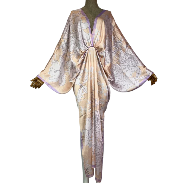 This luxurious silk kaftan dress combines comfort and style with its "cozy chic" design. Made from high-quality silk. this dress offers a soft. gentle touch against the skin and is perfect for any occasion. whether it's a day at the beach or a night out on the town. Elevate your wardrobe with this timeless piece.