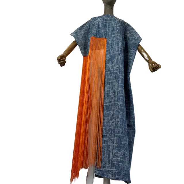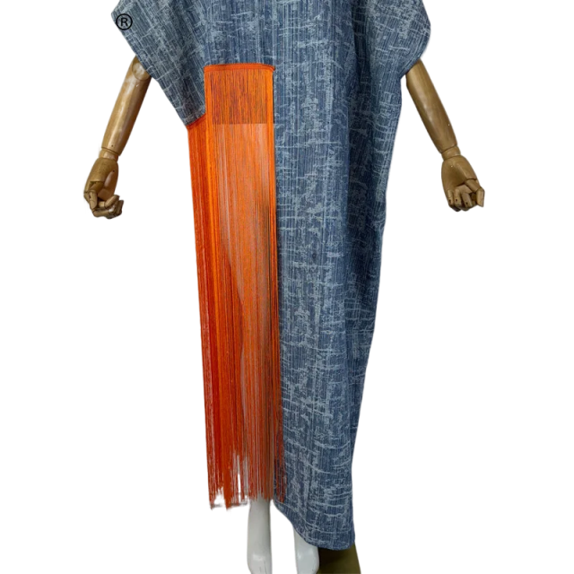 This denim kaftan dress features a stylish tassel design. adding a touch of sophistication to your wardrobe. Made from quality denim fabric. it offers comfort and durability. Perfect for any casual or dressy occasion. Elevate your style with this versatile and trendy piece.