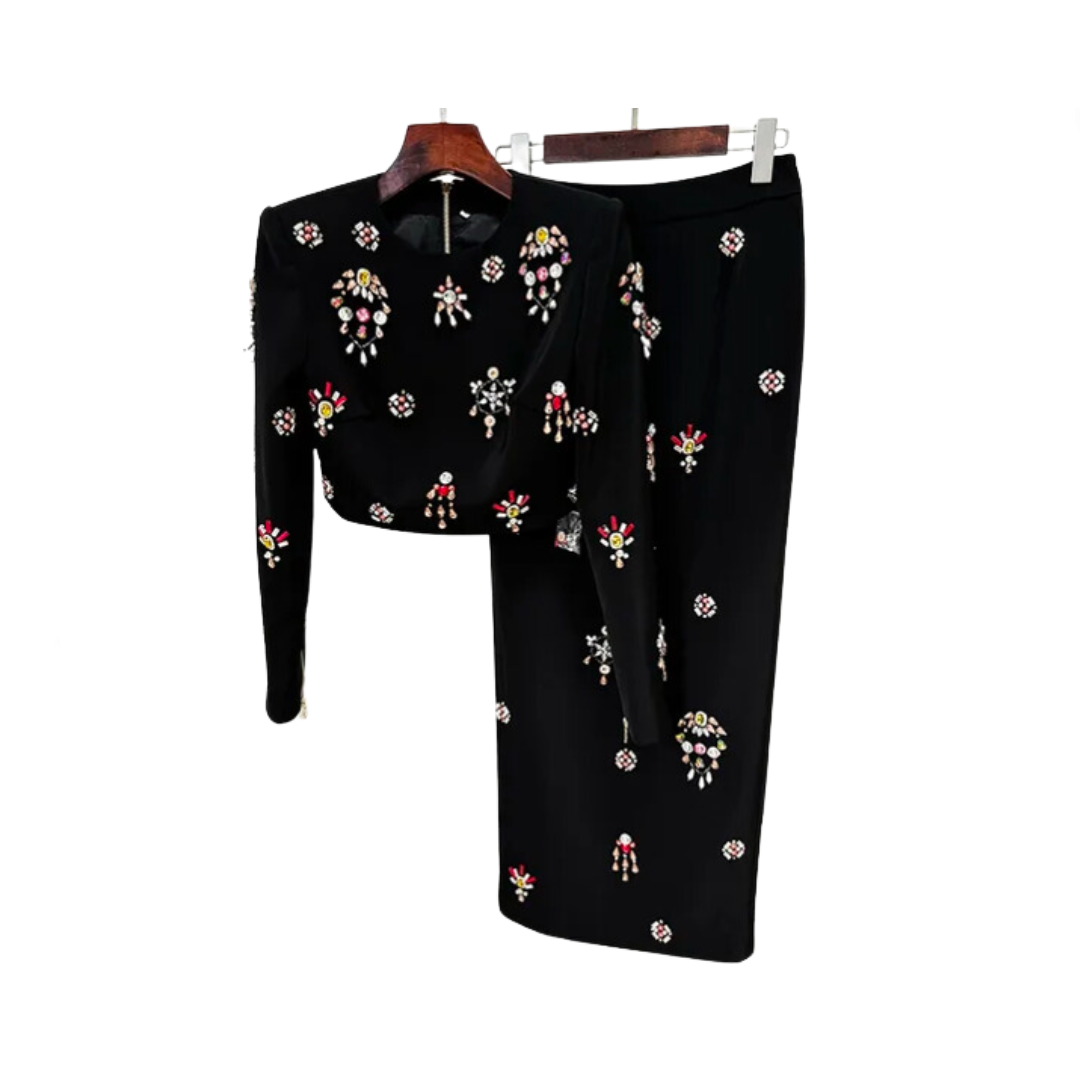 This Flower Diamond Inlaid Set features a short top and midi skirt adorned with beautiful diamond inlays. The perfect set for any formal occasion. this set will make you stand out with its elegant and sophisticated design.